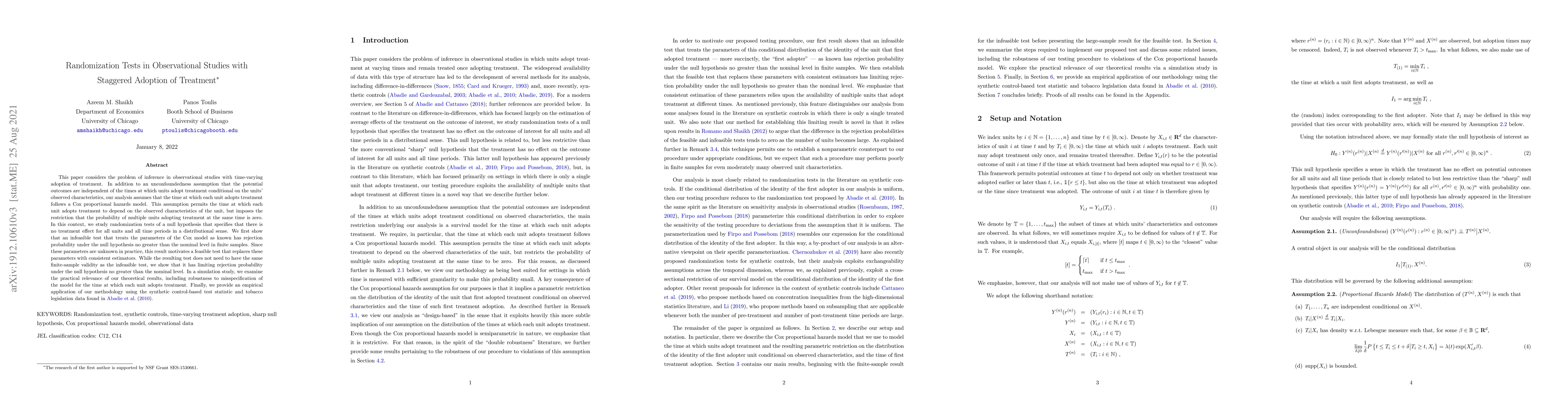 This paper develops a methodology for randomization tests in observational studies with staggered adoption of treatment, considering a Cox proportional hazards model and providing theoretical and practical evidence for its validity. The results suggest that the approach has limiting rejection probability no greater than the nominal level.