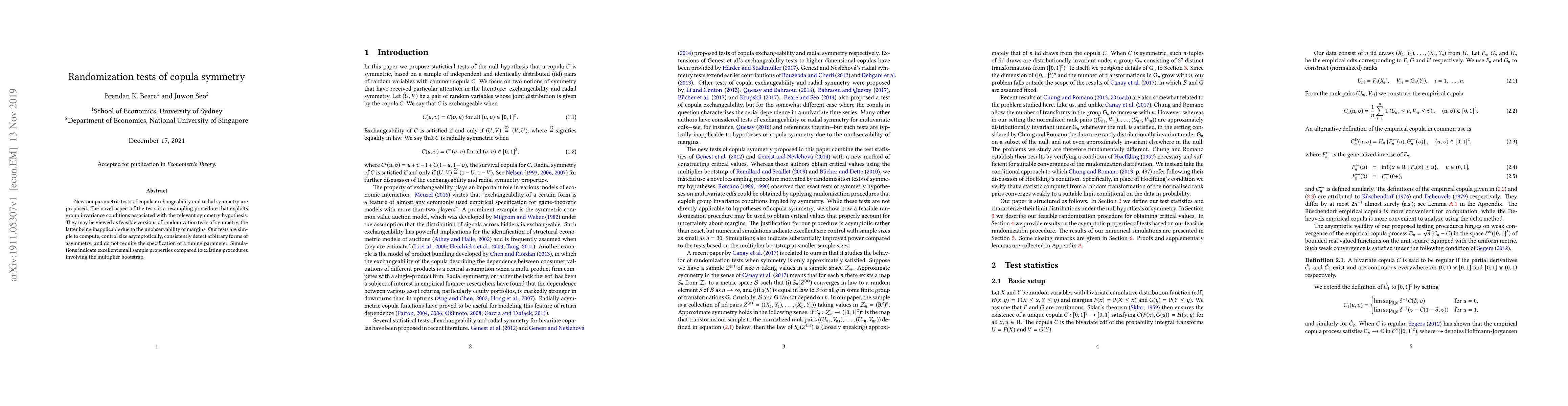 This paper proposes new nonparametric tests for copula symmetry using a resampling procedure that leverages group invariance conditions. These tests are feasible versions of randomization tests and outperform existing methods, showing good small sample properties without requiring tuning parameters.