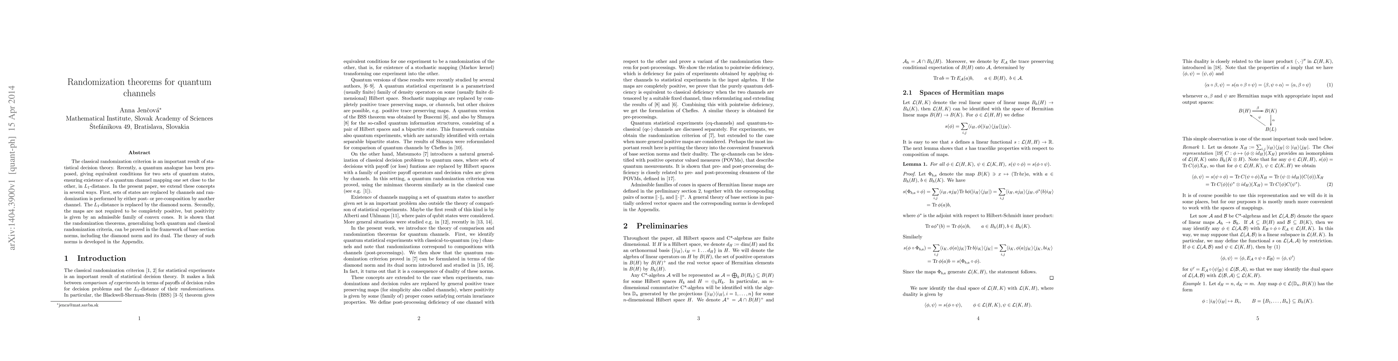 This paper extends classical randomization criteria to quantum channels, replacing state sets with channels and using the diamond norm instead of $L_1$-distance. It generalizes the theorems to non-completely positive maps through admissible convex cones and proves the results within the framework of base section norms.