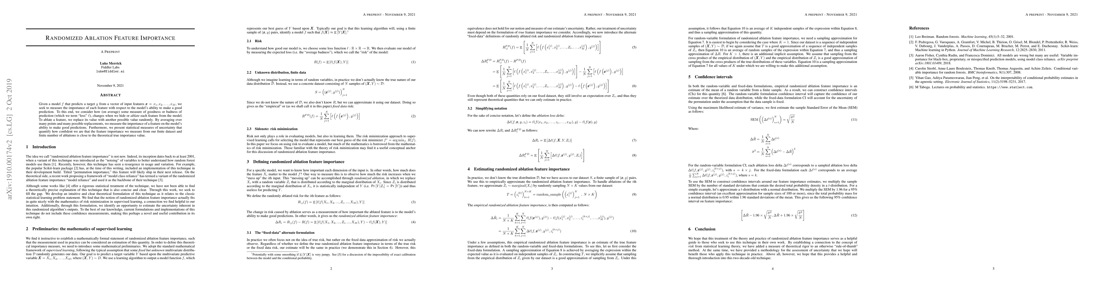 Given a model $f$ that predicts a target $y$ from a vector of input features $\pmb{x} = x_1, x_2, \ldots, x_M$, we seek to measure the importance of each feature with respect to the model's ability to make a good prediction. To this end, we consider how (on average) some measure of goodness or badness of prediction (which we term "loss" $\ell$), changes when we hide or ablate each feature from the model. To ablate a feature, we replace its value with another possible value randomly. By averaging over many points and many possible replacements, we measure the importance of a feature on the model's ability to make good predictions. Furthermore, we present statistical measures of uncertainty that quantify how confident we are that the feature importance we measure from our finite dataset and finite number of ablations is close to the theoretical true importance value.