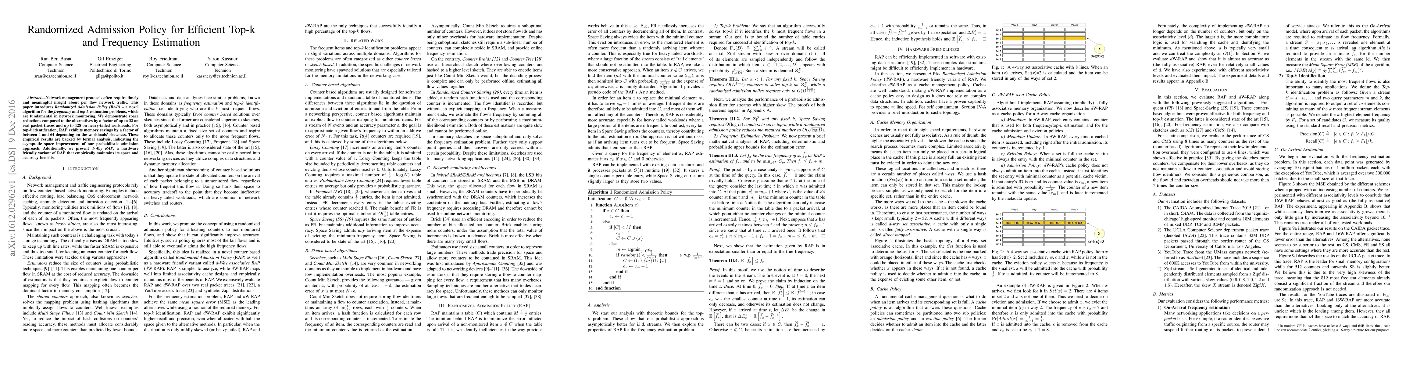 This paper introduces Randomized Admission Policy (RAP), a novel algorithm for efficient top-k and frequency estimation in network monitoring, offering significant space reductions and improved accuracy.
