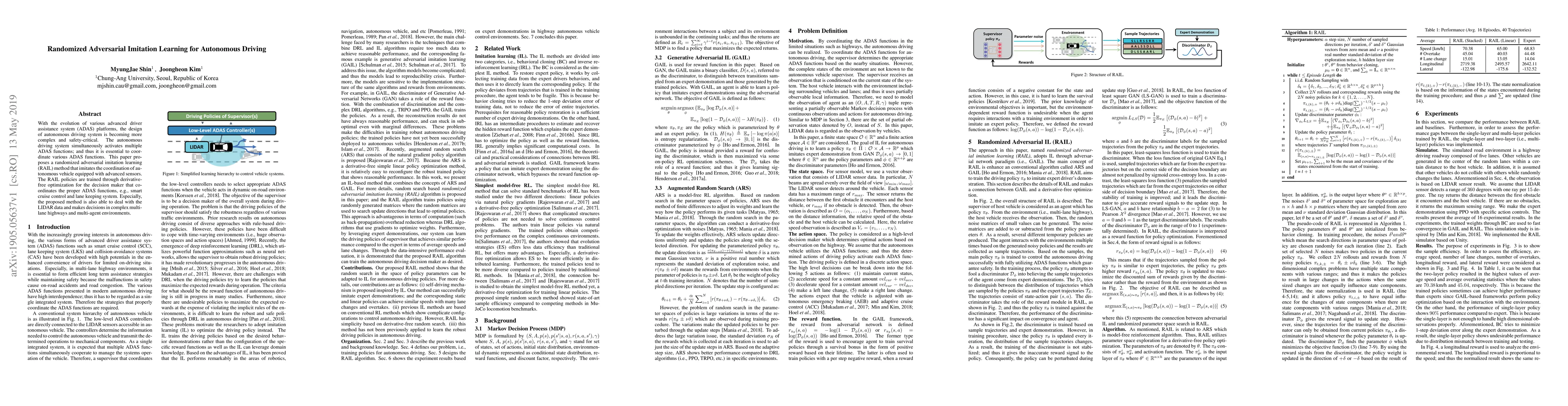 This paper introduces a randomized adversarial imitation learning (RAIL) method to coordinate multiple advanced driver assistance system (ADAS) functions in autonomous driving. The RAIL method trains policies through derivative-free optimization, enabling the system to handle LIDAR data and make decisions in complex multi-lane highway and multi-agent scenarios.