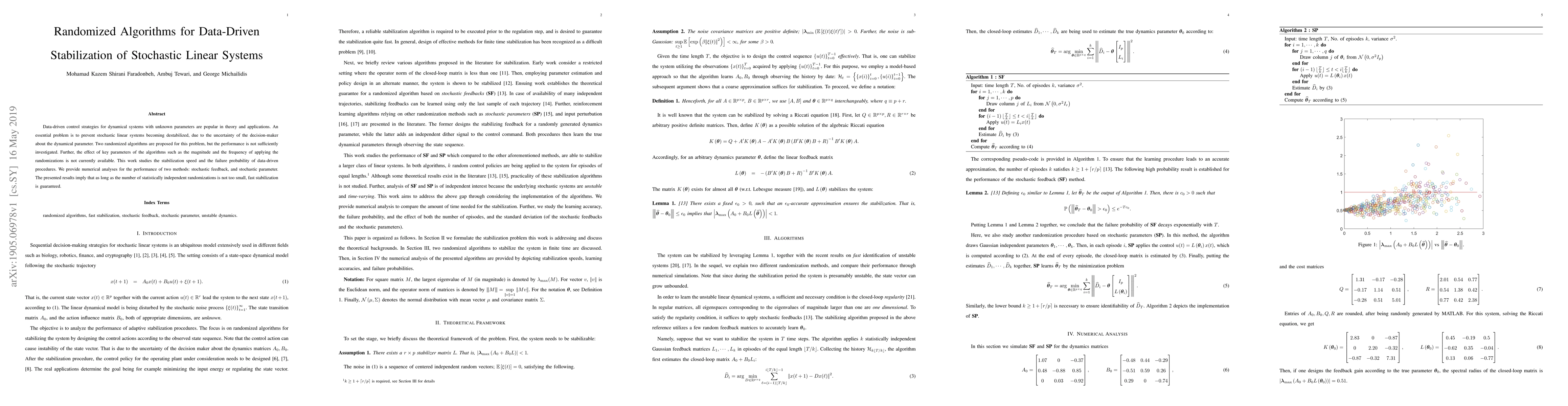 This paper proposes two randomized algorithms for stabilizing stochastic linear systems with unknown parameters, focusing on their stabilization speed and failure probability. Numerical analyses show that fast stabilization is achievable provided the number of independent randomizations is sufficiently large.