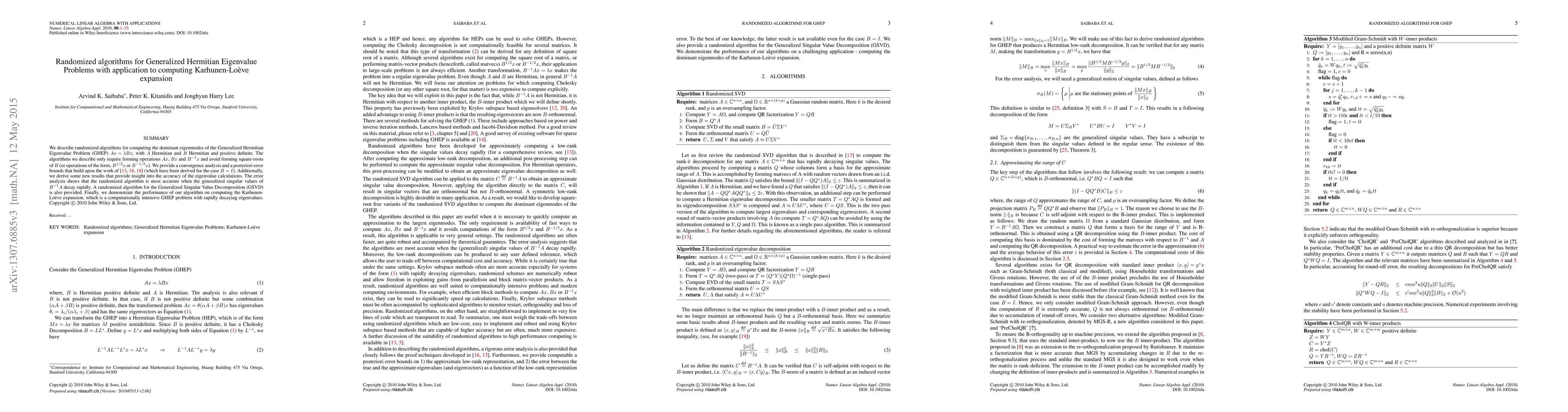 This paper presents randomized algorithms for solving the Generalized Hermitian Eigenvalue Problem (GHEP) without requiring square-root operations on $B$, and provides convergence analysis and a posteriori error bounds. The algorithms are demonstrated for computing the Karhunen-Loève expansion, showing improved accuracy when generalized singular values decay rapidly.