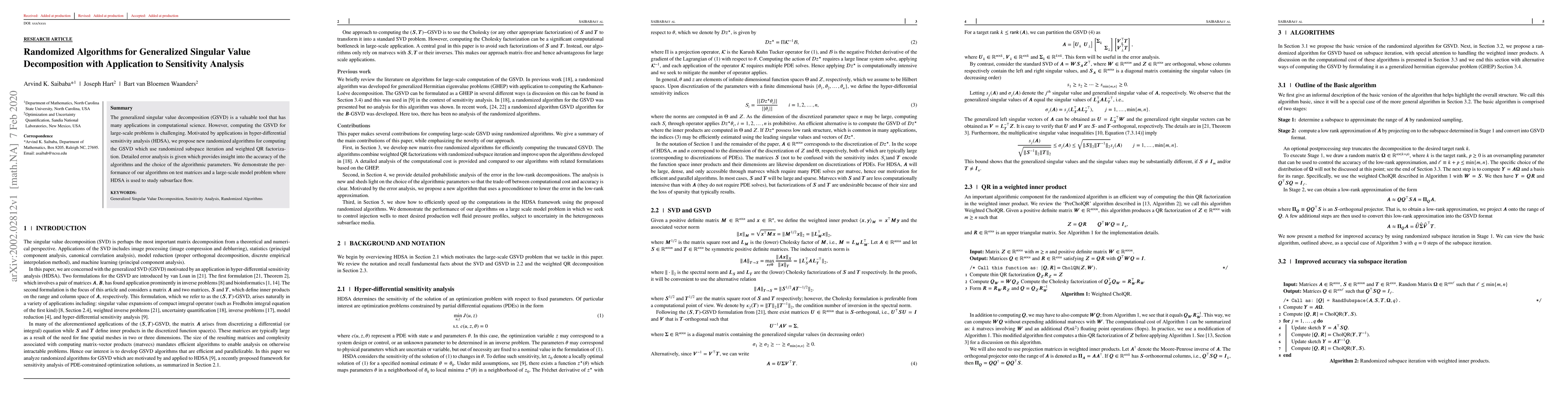 This paper proposes new randomized algorithms for computing the generalized singular value decomposition (GSVD) using subspace iteration and weighted QR factorization, aimed at addressing large-scale computational challenges. The algorithms' accuracy and parameter choices are analyzed, and their effectiveness is demonstrated in hyper-differential sensitivity analysis applications for subsurface flow.