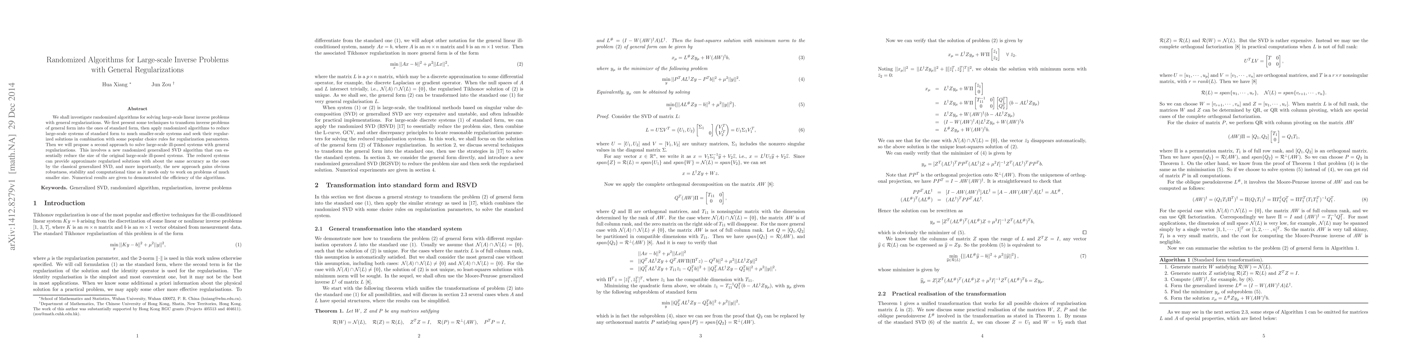 This paper explores randomized algorithms for solving large-scale linear inverse problems with general regularizations, proposing techniques to transform and reduce the problem size, and introducing a new randomized generalized SVD algorithm that enhances robustness, stability, and computational efficiency. Numerical results validate the effectiveness of the proposed methods.