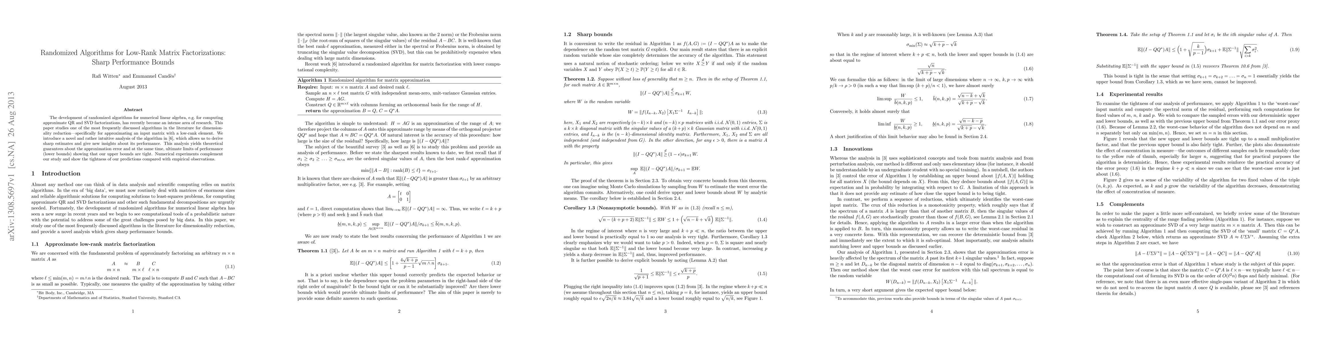 This paper presents a novel analysis of a randomized algorithm for low-rank matrix factorizations, providing sharp performance bounds and demonstrating the tightness of these bounds through theoretical and numerical experiments. The study reveals new insights into the algorithm's approximation error and its ultimate performance limits.