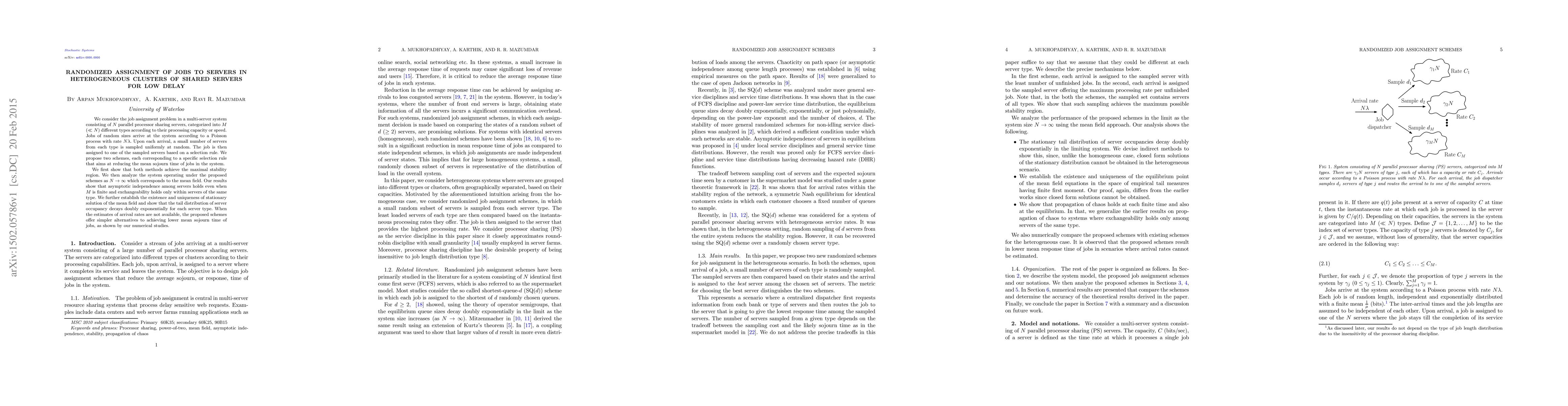 This paper proposes two job assignment schemes for heterogeneous clusters of shared servers to minimize job sojourn time, demonstrating their stability and asymptotic independence. The schemes achieve maximal stability and show doubly exponential decay in server occupancy tail distributions, offering simpler alternatives when arrival rate estimates are unavailable.