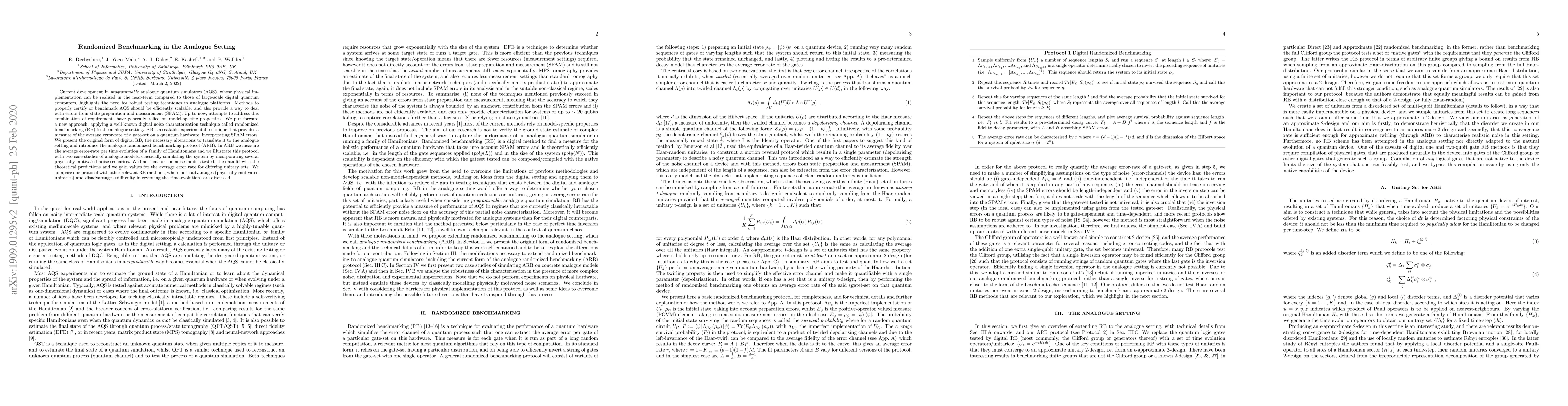 Current development in programmable analogue quantum simulators (AQS), whose physical implementation can be realised in the near-term compared to those of large-scale digital quantum computers, highlights the need for robust testing techniques in analogue platforms. Methods to properly certify or benchmark AQS should be efficiently scalable, and also provide a way to deal with errors from state preparation and measurement (SPAM). Up to now, attempts to address this combination of requirements have generally relied on model-specific properties. We put forward a new approach, applying a well-known digital noise characterisation technique called randomized benchmarking (RB) to the analogue setting. RB is a scalable experimental technique that provides a measure of the average error-rate of a gate-set on a quantum hardware, incorporating SPAM errors. We present the original form of digital RB, the necessary alterations to translate it to the analogue setting and introduce the analogue randomized benchmarking protocol (ARB). In ARB we measure the average error-rate per time evolution of a family of Hamiltonians and we illustrate this protocol with two case-studies of analogue models; classically simulating the system by incorporating several physically motivated noise scenarios. We find that for the noise models tested, the data fit with the theoretical predictions and we gain values for the average error rate for differing unitary sets. We compare our protocol with other relevant RB methods, where both advantages (physically motivated unitaries) and disadvantages (difficulty in reversing the time-evolution) are discussed.