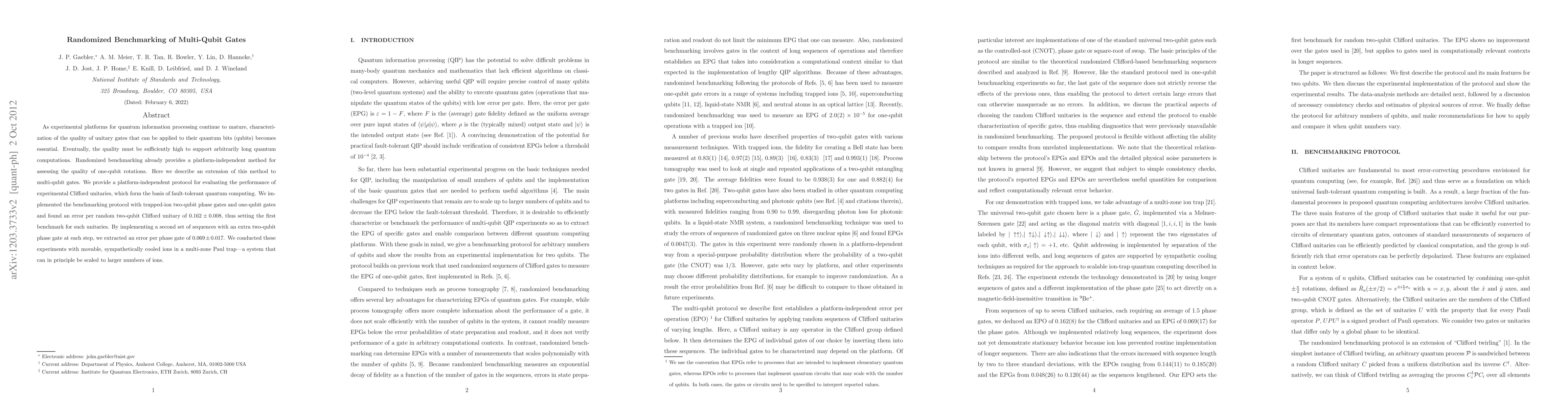 This paper presents a platform-independent method for evaluating the performance of multi-qubit gates using randomized benchmarking, specifically applied to trapped-ion systems. The study benchmarks Clifford unitaries and reports an error rate of $0.162 \pm 0.008$ per random two-qubit Clifford unitary and $0.069 \pm 0.017$ per phase gate, demonstrating the method's potential for fault-tolerant quantum computing.