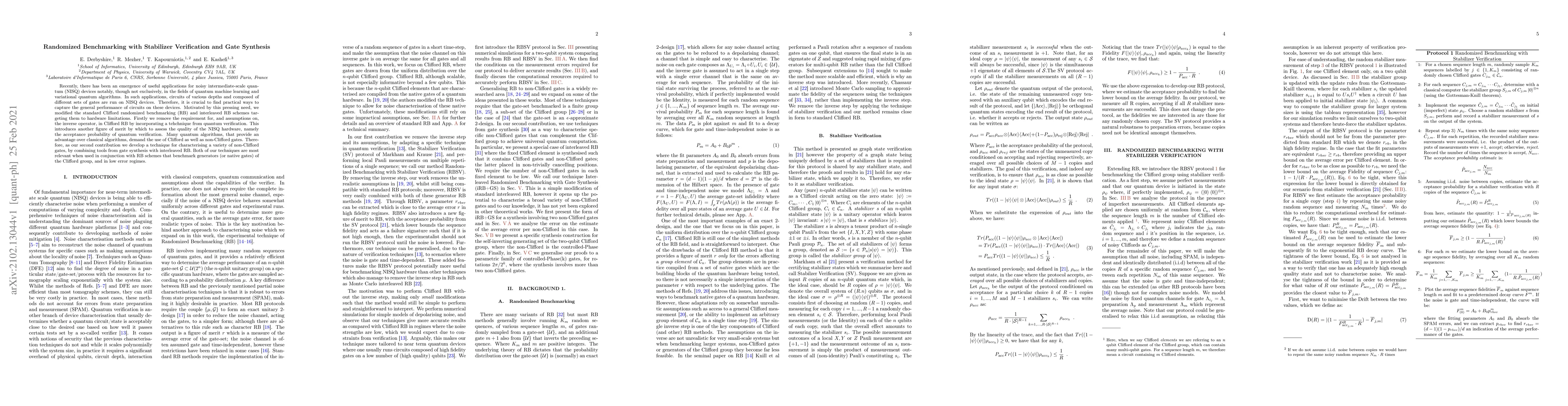 This paper proposes modified randomized benchmarking techniques for noisy intermediate-scale quantum devices, removing the need for inverse operators and incorporating quantum verification to assess hardware quality. It also introduces a method for characterizing non-Clifford gates using gate synthesis and interleaved randomized benchmarking.