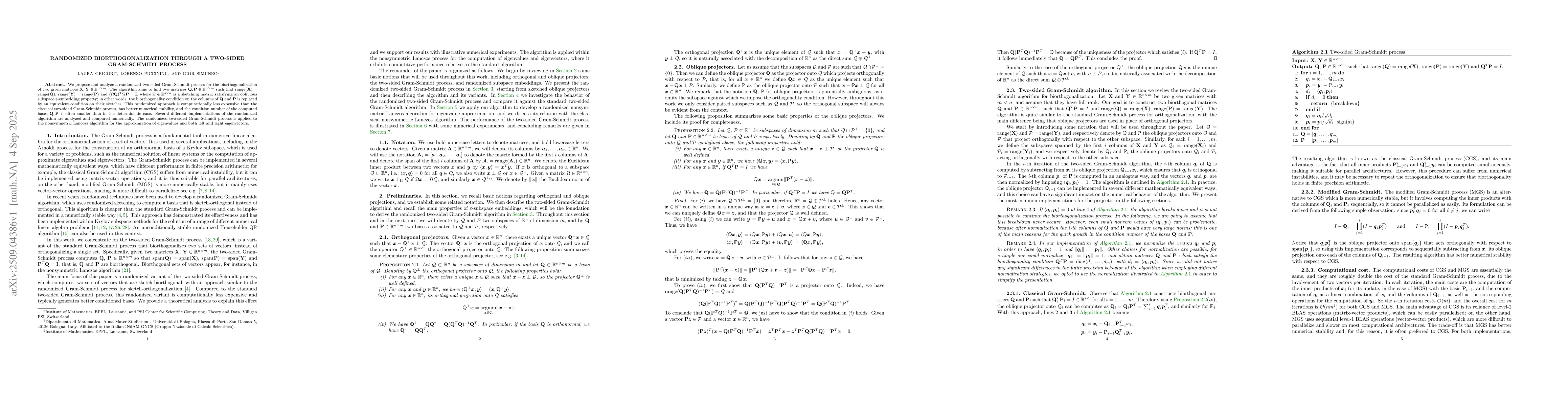 We propose and analyze a randomized two-sided Gram-Schmidt process for the biorthogonalization of two given matrices $X, Y \in\mathbb{R}^{n\times m}$. The algorithm aims to find two matrices $Q, P \in\mathbb{R}^{n\times m}$ such that ${\rm range}(X) = {\rm range}(Q)$, ${\rm range}(Y) = {\rm range}(P)$ and $(\Omega Q)^T \Omega P = I$, where $\Omega \in\mathbb{R}^{s \times n}$ is a sketching matrix satisfying an oblivious subspace $\varepsilon$-embedding property; in other words, the biorthogonality condition on the columns of $Q$ and $P$ is replaced by an equivalent condition on their sketches. This randomized approach is computationally less expensive than the classical two-sided Gram-Schmidt process, has better numerical stability, and the condition number of the computed bases $Q, P$ is often smaller than in the deterministic case. Several different implementations of the randomized algorithm are analyzed and compared numerically. The randomized two-sided Gram-Schmidt process is applied to the nonsymmetric Lancozs algorithm for the approximation of eigenvalues and both left and right eigenvectors.