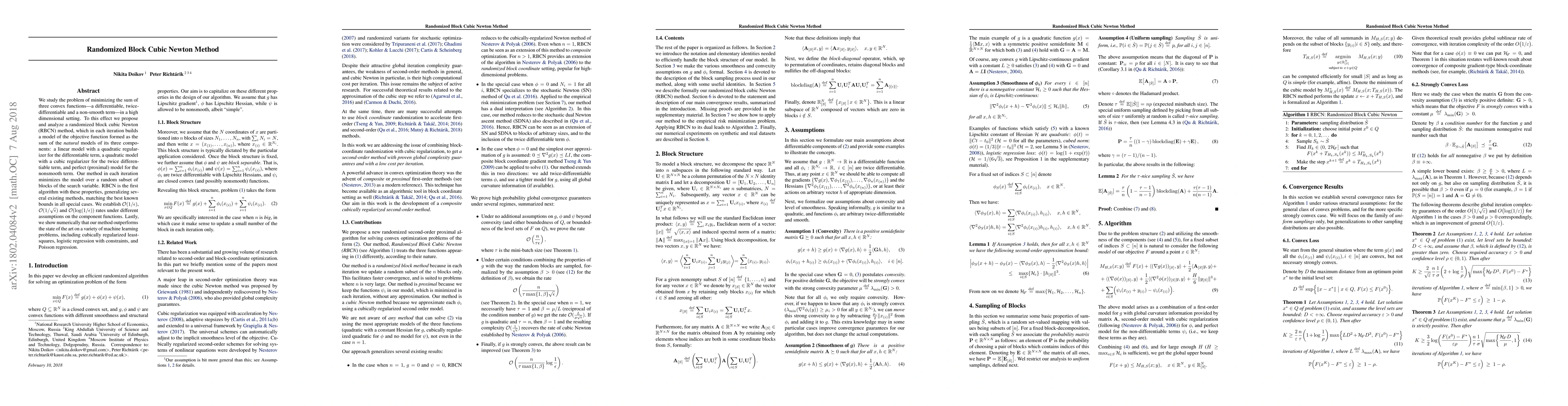 We study the problem of minimizing the sum of three convex functions: a differentiable, twice-differentiable and a non-smooth term in a high dimensional setting. To this effect we propose and analyze a randomized block cubic Newton (RBCN) method, which in each iteration builds a model of the objective function formed as the sum of the natural models of its three components: a linear model with a quadratic regularizer for the differentiable term, a quadratic model with a cubic regularizer for the twice differentiable term, and perfect (proximal) model for the nonsmooth term. Our method in each iteration minimizes the model over a random subset of blocks of the search variable. RBCN is the first algorithm with these properties, generalizing several existing methods, matching the best known bounds in all special cases. We establish ${\cal O}(1/\epsilon)$, ${\cal O}(1/\sqrt{\epsilon})$ and ${\cal O}(\log (1/\epsilon))$ rates under different assumptions on the component functions. Lastly, we show numerically that our method outperforms the state-of-the-art on a variety of machine learning problems, including cubically regularized least-squares, logistic regression with constraints, and Poisson regression.