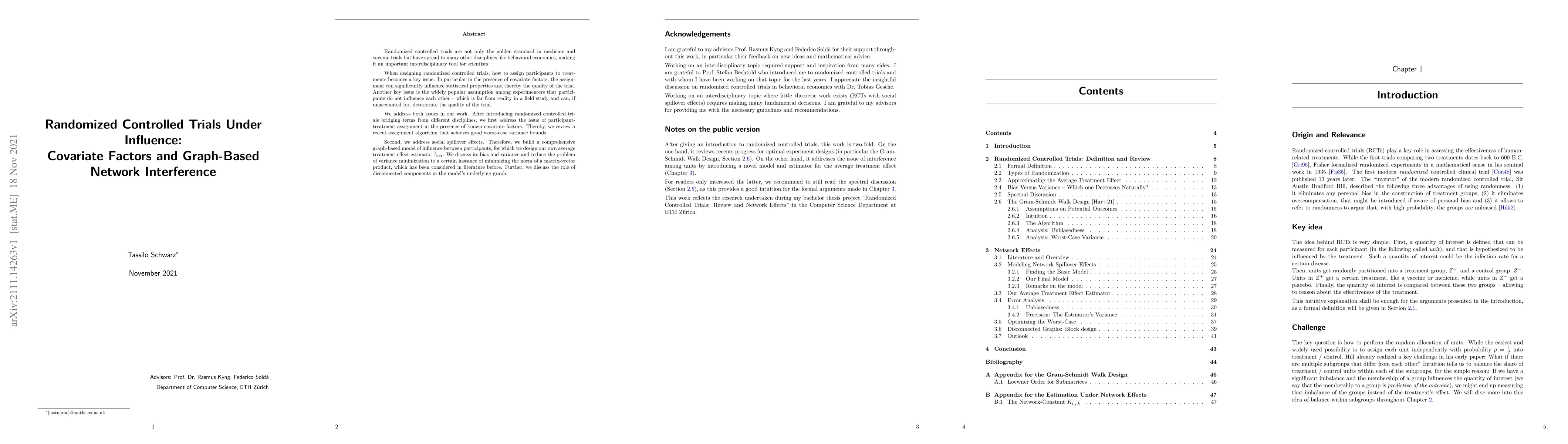 Randomized controlled trials are not only the golden standard in medicine and vaccine trials but have spread to many other disciplines like behavioral economics, making it an important interdisciplinary tool for scientists. When designing randomized controlled trials, how to assign participants to treatments becomes a key issue. In particular in the presence of covariate factors, the assignment can significantly influence statistical properties and thereby the quality of the trial. Another key issue is the widely popular assumption among experimenters that participants do not influence each other -- which is far from reality in a field study and can, if unaccounted for, deteriorate the quality of the trial. We address both issues in our work. After introducing randomized controlled trials bridging terms from different disciplines, we first address the issue of participant-treatment assignment in the presence of known covariate factors. Thereby, we review a recent assignment algorithm that achieves good worst-case variance bounds. Second, we address social spillover effects. Therefore, we build a comprehensive graph-based model of influence between participants, for which we design our own average treatment effect estimator $\hat \tau_{net}$. We discuss its bias and variance and reduce the problem of variance minimization to a certain instance of minimizing the norm of a matrix-vector product, which has been considered in literature before. Further, we discuss the role of disconnected components in the model's underlying graph.