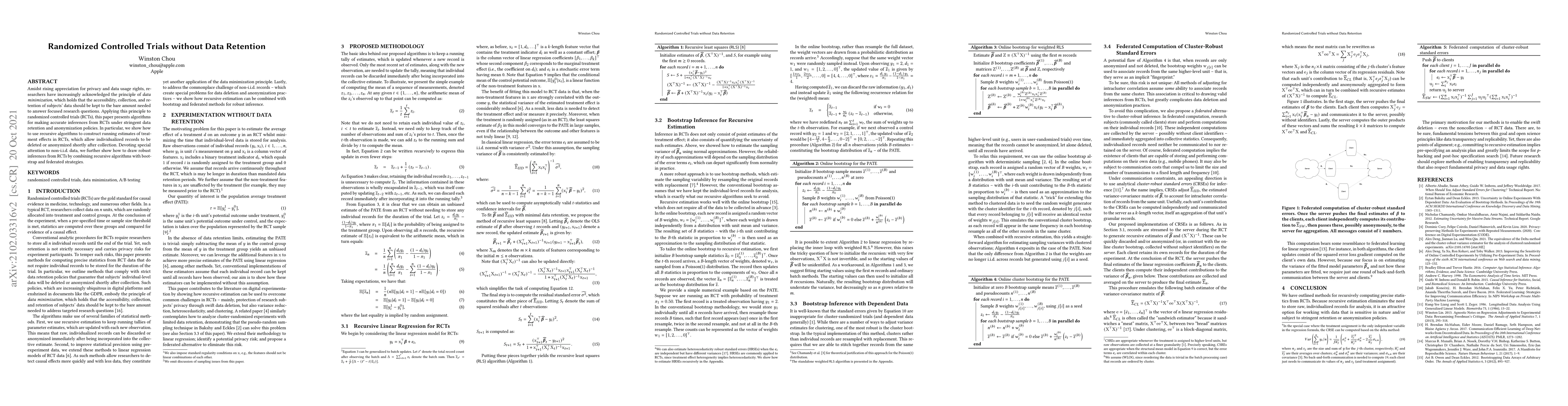 This paper proposes algorithms for conducting randomized controlled trials (RCTs) under strict data retention and anonymization policies, emphasizing data minimization. It introduces recursive methods for estimating treatment effects while allowing for the deletion or anonymization of individual records soon after collection, and combines these with bootstrap and federated strategies to draw robust inferences from non-independent and identically distributed data.