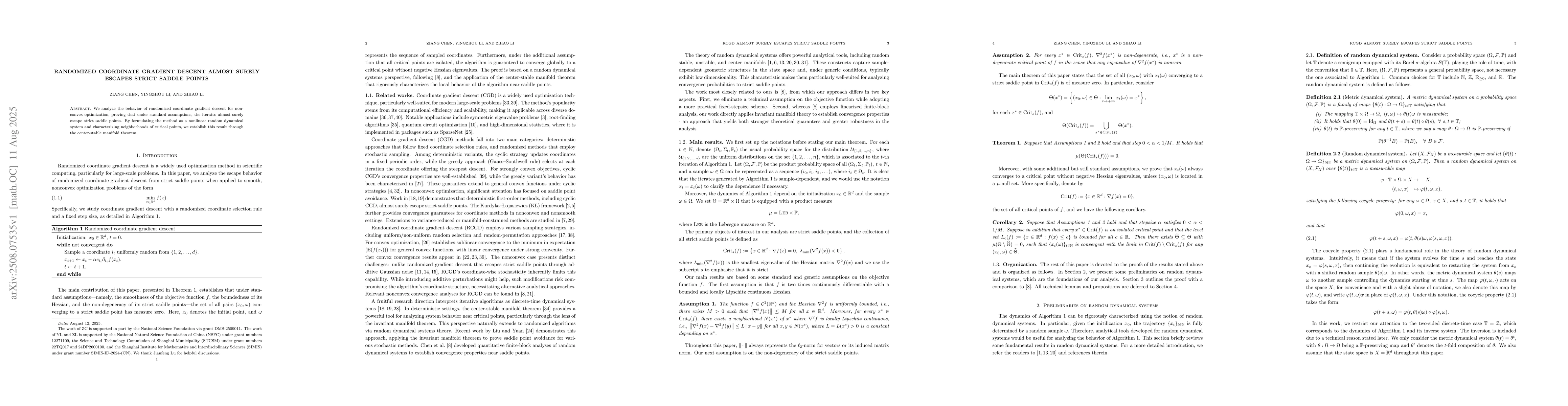 The paper analyzes randomized coordinate gradient descent for nonconvex optimization, proving that under standard assumptions, the iterates almost surely escape strict saddle points by formulating the method as a nonlinear random dynamical system and characterizing neighborhoods of critical points using the center-stable manifold theorem.
