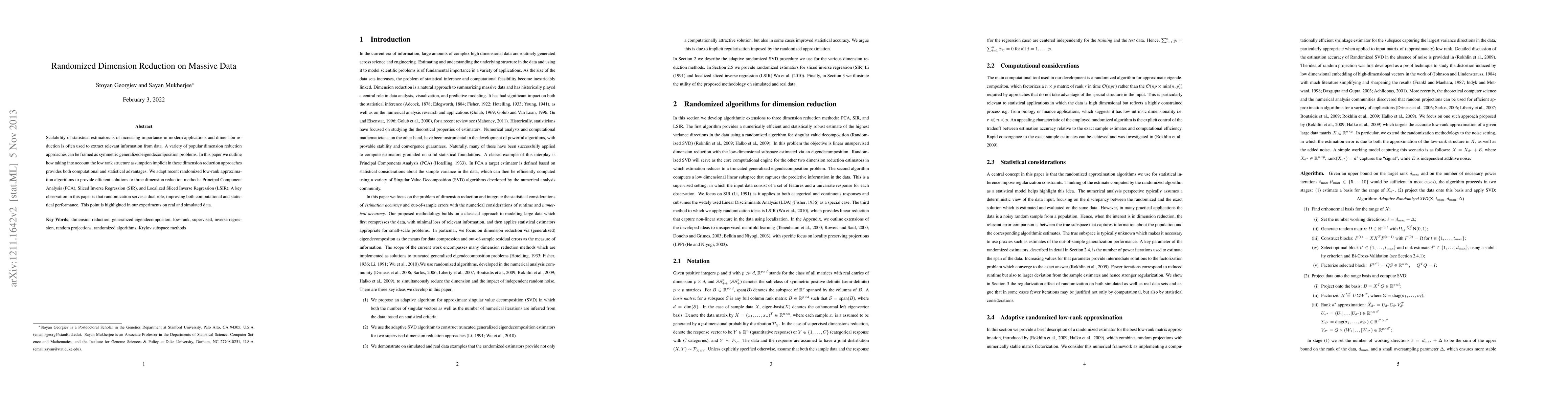 This paper explores the scalability of dimension reduction techniques by leveraging randomized low-rank approximation algorithms, demonstrating computational and statistical benefits for PCA, SIR, and LSIR. The study shows that randomization enhances both computational efficiency and statistical accuracy, as evidenced by experiments on real and simulated data.