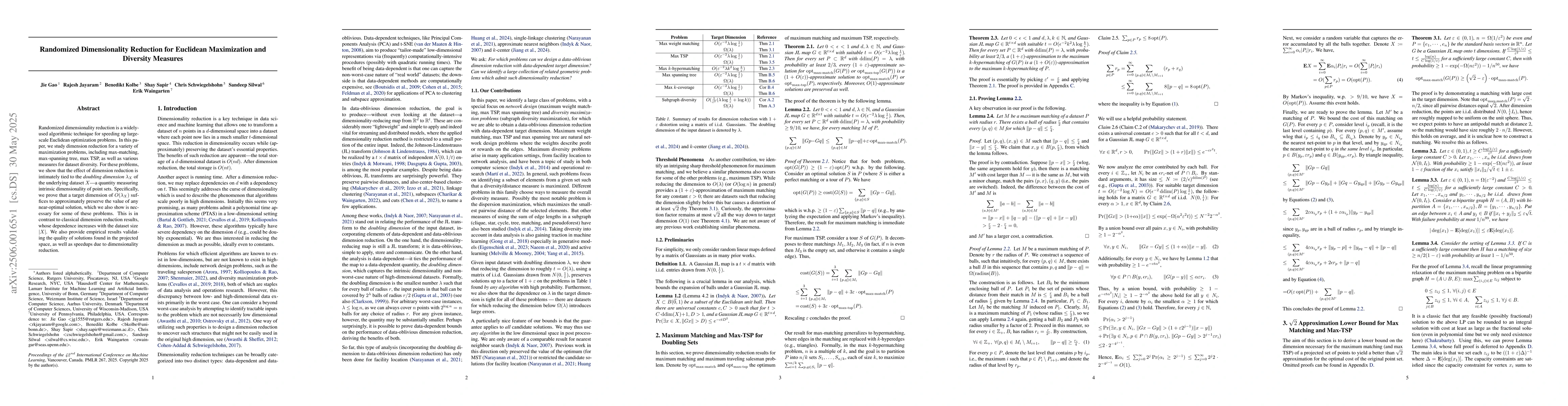 Researchers found that for maximizing problems like max-matching and max-TSP, reducing dimensionality to $O( ext{doubling dimension})$ of the dataset can preserve near-optimal solutions with high accuracy.