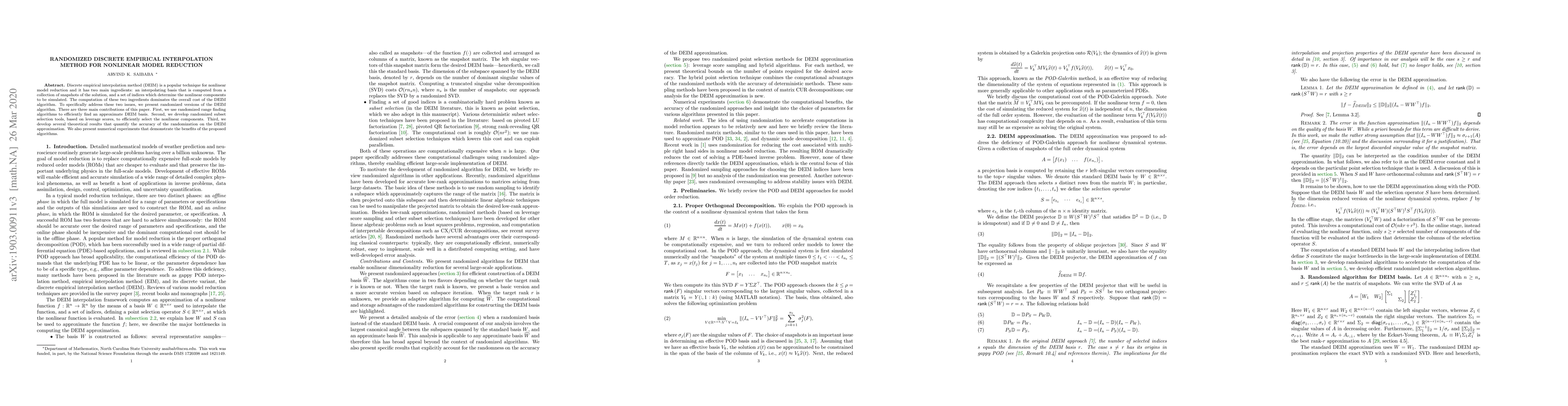 This paper introduces randomized versions of the Discrete Empirical Interpolation Method (DEIM) to improve efficiency in nonlinear model reduction. The key contributions include randomized range finding for basis approximation, randomized subset selection for component simulation, and theoretical accuracy analysis. Numerical experiments validate the effectiveness of the proposed algorithms.