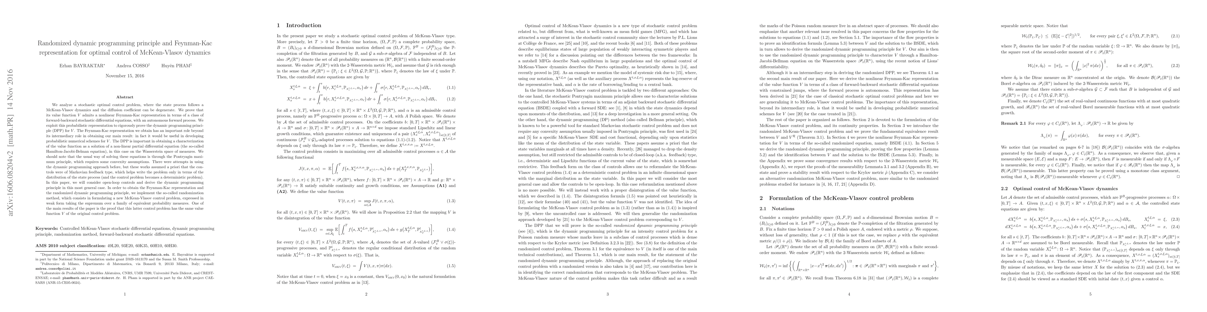 We analyze a stochastic optimal control problem, where the state process follows a McKean-Vlasov dynamics and the diffusion coefficient can be degenerate. We prove that its value function V admits a nonlinear Feynman-Kac representation in terms of a class of forward-backward stochastic differential equations, with an autonomous forward process. We exploit this probabilistic representation to rigorously prove the dynamic programming principle (DPP) for V. The Feynman-Kac representation we obtain has an important role beyond its intermediary role in obtaining our main result: in fact it would be useful in developing probabilistic numerical schemes for V. The DPP is important in obtaining a characterization of the value function as a solution of a non-linear partial differential equation (the so-called Hamilton-Jacobi-Belman equation), in this case on the Wasserstein space of measures. We should note that the usual way of solving these equations is through the Pontryagin maximum principle, which requires some convexity assumptions. There were attempts in using the dynamic programming approach before, but these works assumed a priori that the controls were of Markovian feedback type, which helps write the problem only in terms of the distribution of the state process (and the control problem becomes a deterministic problem). In this paper, we will consider open-loop controls and derive the dynamic programming principle in this most general case. In order to obtain the Feynman-Kac representation and the randomized dynamic programming principle, we implement the so-called randomization method, which consists in formulating a new McKean-Vlasov control problem, expressed in weak form taking the supremum over a family of equivalent probability measures. One of the main results of the paper is the proof that this latter control problem has the same value function V of the original control problem.
