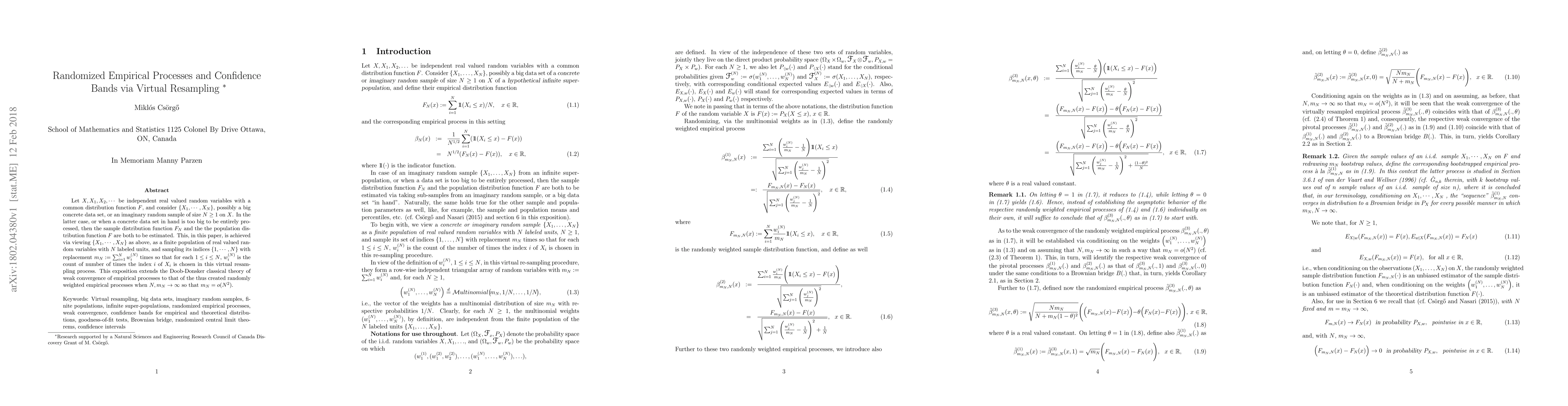 This paper explores the use of virtual resampling to estimate the sample and population distribution functions for large datasets. It extends the classical theory of weak convergence of empirical processes to randomly weighted empirical processes, providing confidence bands for distribution function estimation.