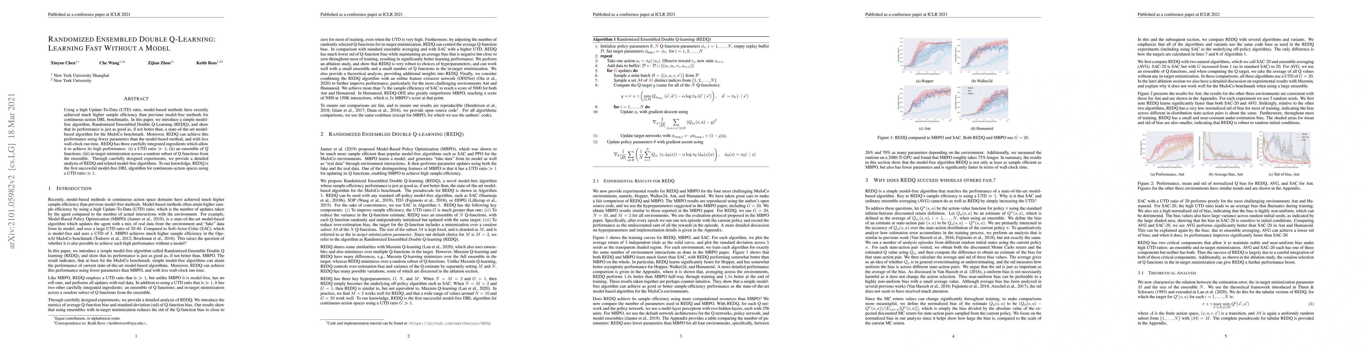This paper introduces Randomized Ensembled Double Q-Learning (REDQ), a model-free reinforcement learning algorithm that achieves high performance comparable to state-of-the-art model-based methods using fewer parameters and less time. REDQ leverages a high Update-To-Data ratio, an ensemble of Q functions, and in-target minimization to outperform model-based approaches on the MuJoCo benchmark.
