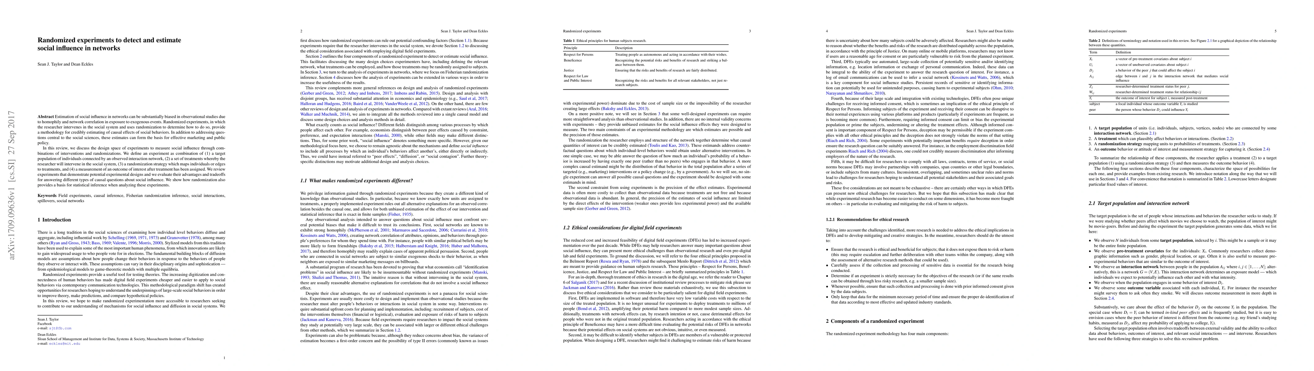 Estimation of social influence in networks can be substantially biased in observational studies due to homophily and network correlation in exposure to exogenous events. Randomized experiments, in which the researcher intervenes in the social system and uses randomization to determine how to do so, provide a methodology for credibly estimating of causal effects of social behaviors. In addition to addressing questions central to the social sciences, these estimates can form the basis for effective marketing and public policy. In this review, we discuss the design space of experiments to measure social influence through combinations of interventions and randomizations. We define an experiment as combination of (1) a target population of individuals connected by an observed interaction network, (2) a set of treatments whereby the researcher will intervene in the social system, (3) a randomization strategy which maps individuals or edges to treatments, and (4) a measurement of an outcome of interest after treatment has been assigned. We review experiments that demonstrate potential experimental designs and we evaluate their advantages and tradeoffs for answering different types of causal questions about social influence. We show how randomization also provides a basis for statistical inference when analyzing these experiments.
