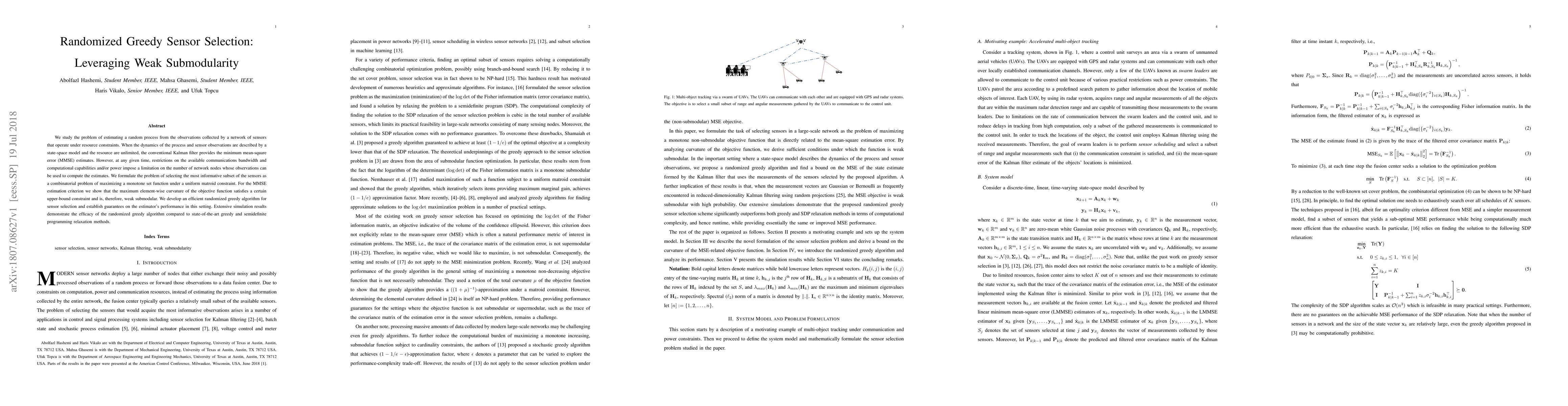 This paper proposes a randomized greedy algorithm for selecting the most informative subset of sensors under resource constraints for estimating a random process. It leverages weak submodularity of the objective function and demonstrates superior performance compared to existing methods through simulations.
