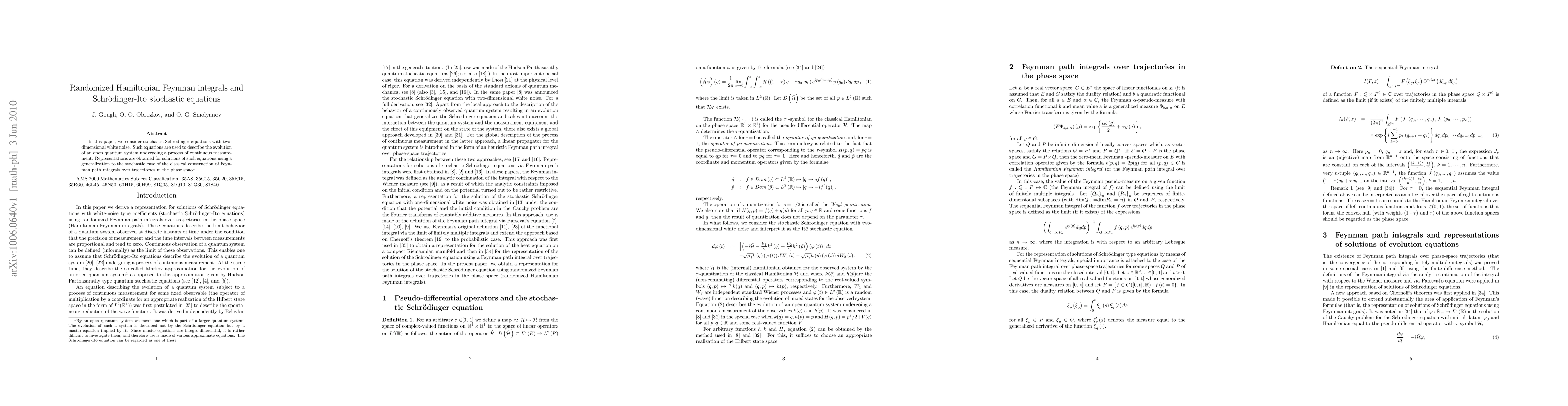 In this paper, we consider stochastic Schroedinger equations with two-dimensional white noise. Such equations are used to describe the evolution of an open quantum system undergoing a process of continuous measurement. Representations are obtained for solutions of such equations using a generalization to the stochastic case of the classical construction of Feynman path integrals over trajectories in the phase space.
