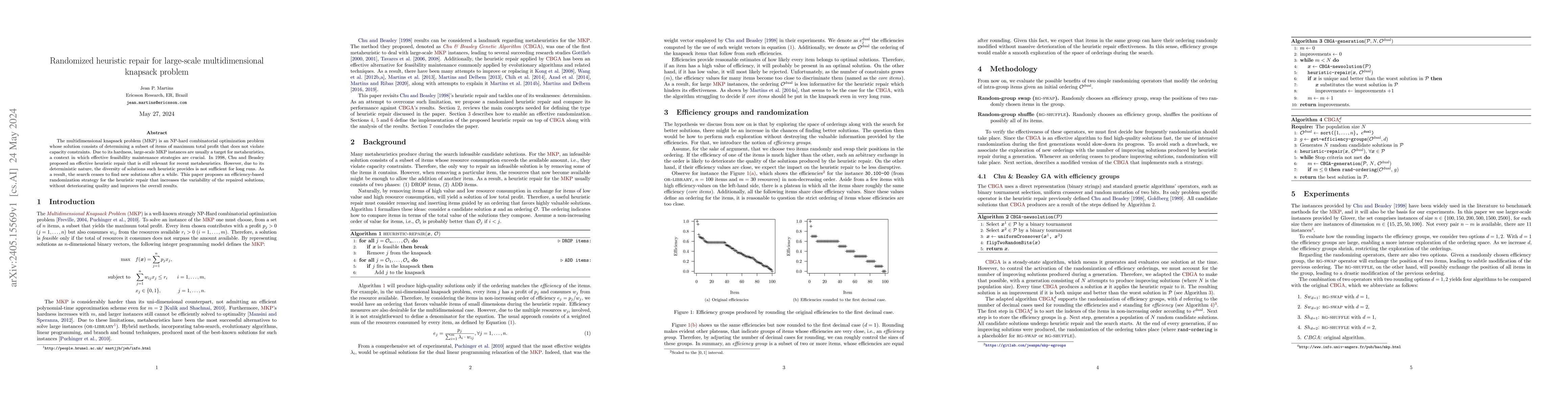 This paper proposes a randomized heuristic repair method to enhance the efficiency of metaheuristics for large-scale multidimensional knapsack problems, aiming to increase solution diversity and maintain solution quality over long runs. The approach seeks to improve upon existing deterministic methods by introducing variability to the repair process.