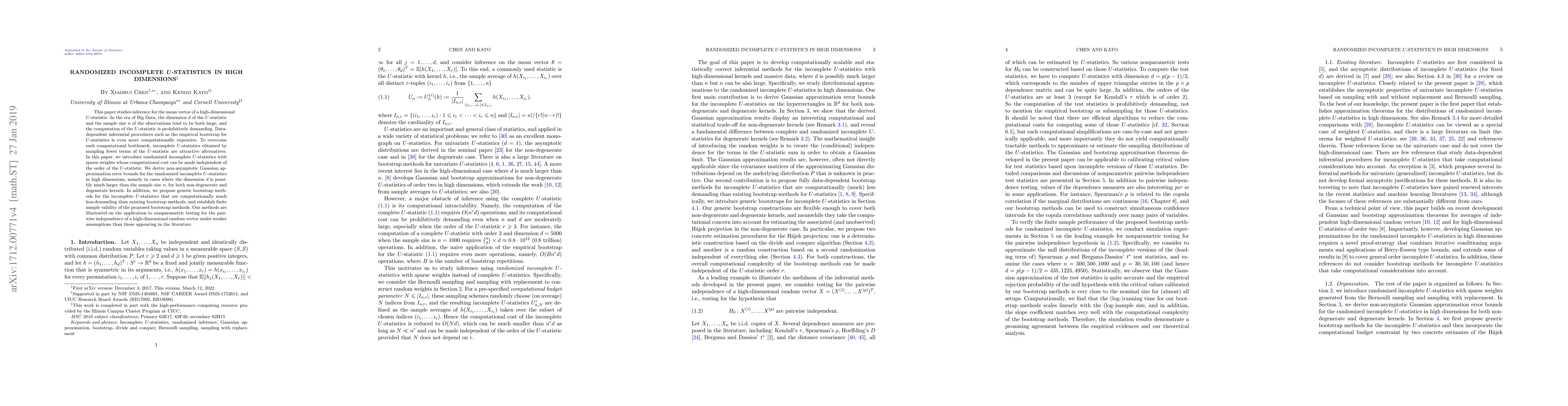 This paper introduces randomized incomplete $U$-statistics to efficiently infer the mean vector of high-dimensional $U$-statistics, offering computationally feasible alternatives to traditional methods. It provides non-asymptotic Gaussian approximation error bounds and proposes less demanding bootstrap methods, demonstrating their application in testing pairwise independence in high dimensions.