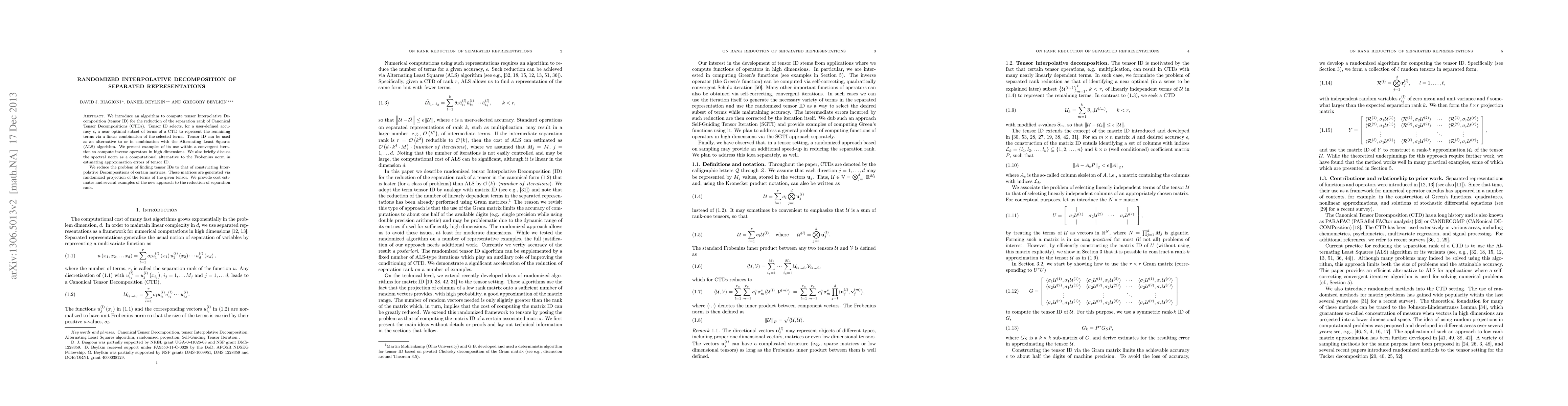 This paper introduces tensor Interpolative Decomposition (tensor ID) to reduce the separation rank of Canonical Tensor Decompositions (CTDs) by selecting a near-optimal subset of terms for a given accuracy. It also discusses combining tensor ID with Q-factorization and randomized techniques to achieve a new paradigm for reducing the rank, along with computational alternatives like the spectral norm.