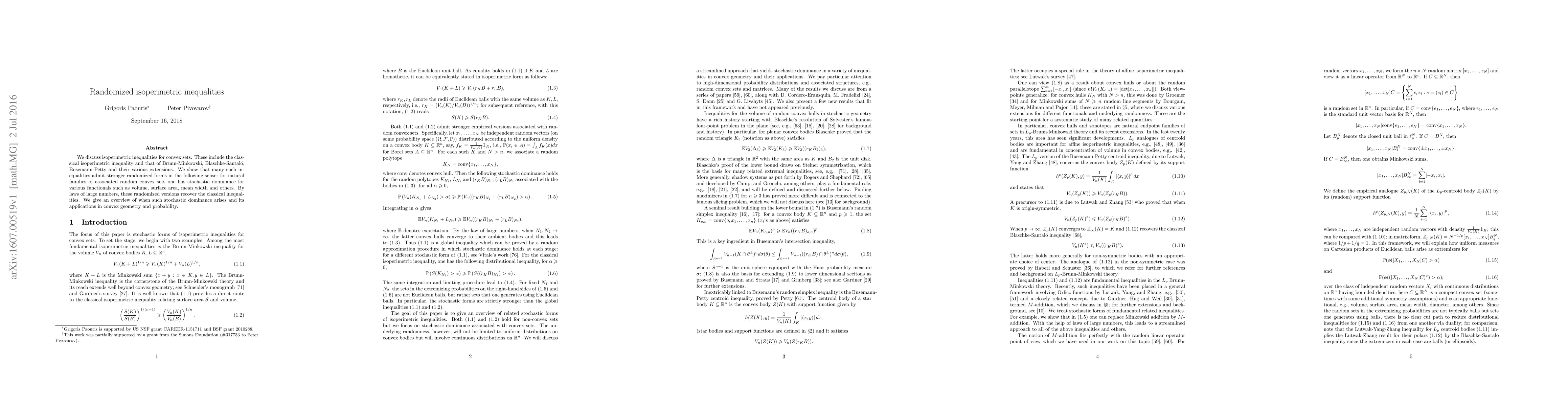 This paper explores randomized versions of classical isoperimetric inequalities for convex sets, demonstrating stochastic dominance for functionals like volume and surface area. These randomized forms recover the original inequalities via laws of large numbers, highlighting their applications in convex geometry and probability.