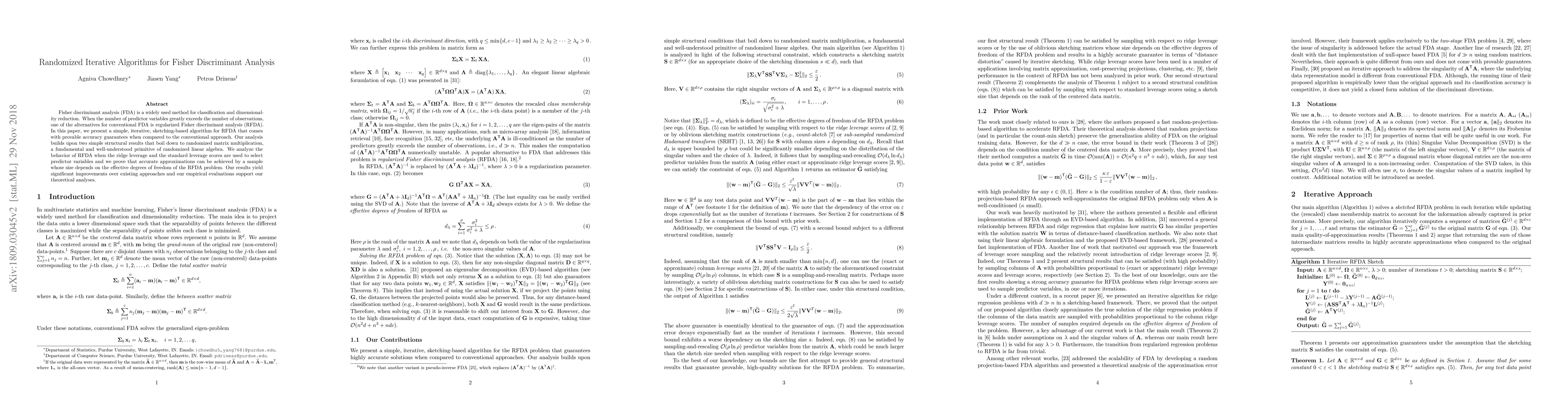 This paper introduces a randomized iterative algorithm for regularized Fisher discriminant analysis (RFDA) that provides provable accuracy guarantees. The algorithm leverages randomized matrix multiplication and achieves significant improvements over conventional methods, supported by both theoretical analysis and empirical evaluations.