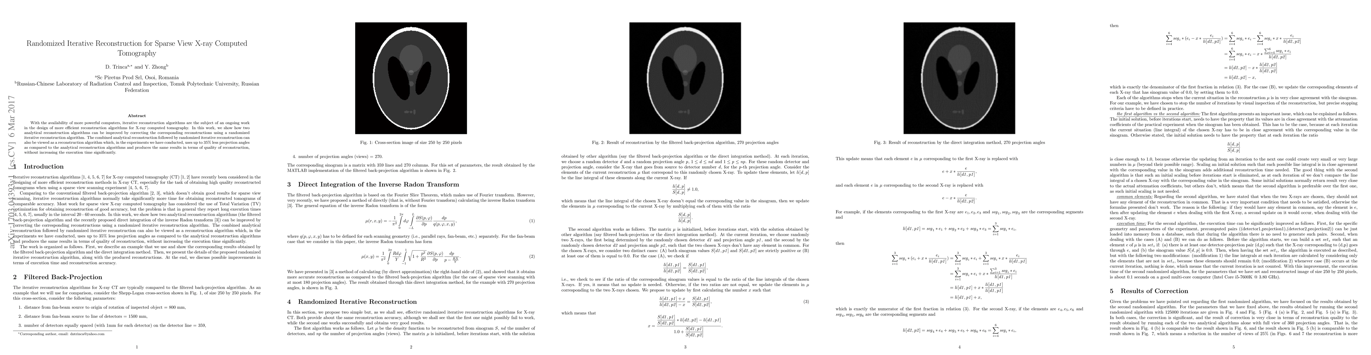 This paper proposes an improved iterative reconstruction algorithm for sparse view X-ray computed tomography that combines analytical reconstruction with randomized iterative refinement, achieving up to 35% fewer projection angles while maintaining reconstruction quality and execution time.