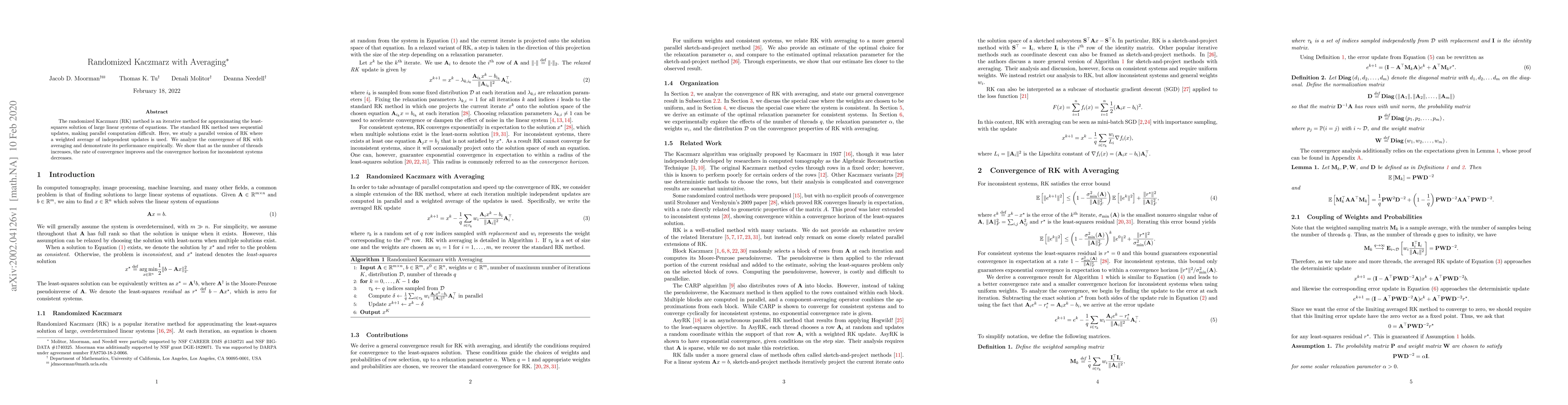 The randomized Kaczmarz (RK) method is an iterative method for approximating the least-squares solution of large linear systems of equations. The standard RK method uses sequential updates, making parallel computation difficult. Here, we study a parallel version of RK where a weighted average of independent updates is used. We analyze the convergence of RK with averaging and demonstrate its performance empirically. We show that as the number of threads increases, the rate of convergence improves and the convergence horizon for inconsistent systems decreases.