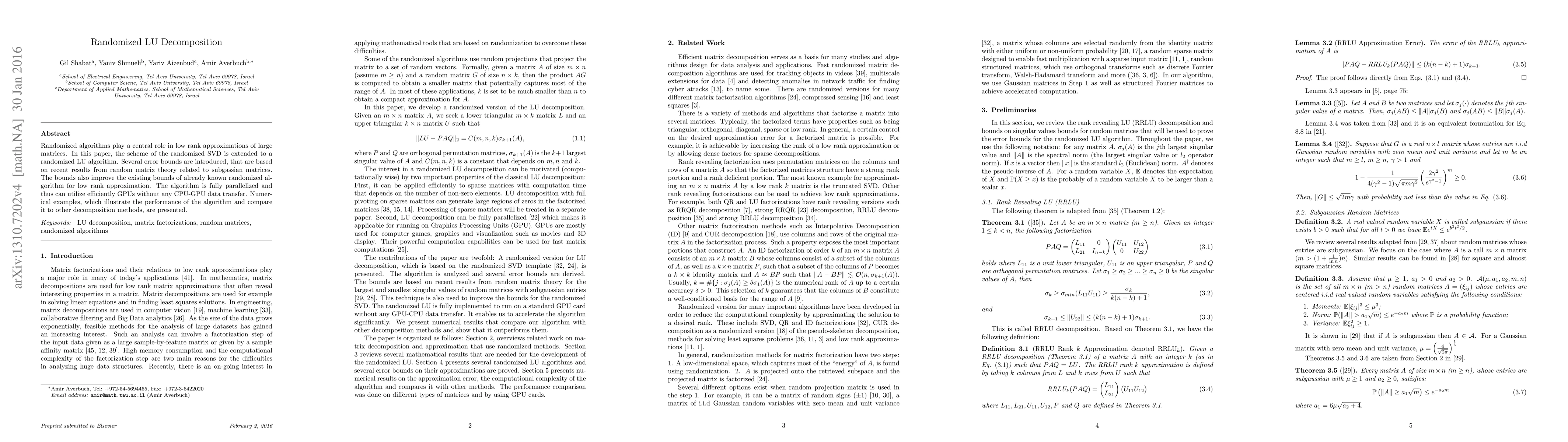We present a fast randomized algorithm that computes a low rank LU decomposition. Our algorithm uses random projections type techniques to efficiently compute a low rank approximation of large matrices. The randomized LU algorithm can be parallelized and further accelerated by using sparse random matrices in its projection step. Several different error bounds are proven for the algorithm approximations. To prove these bounds, recent results from random matrix theory related to subgaussian matrices are used. As an application, we also show how the algorithm can be utilized to solve problems such as the rank-deficient least squares problem. Numerical examples, which illustrate the performance of the algorithm and compare it to other decomposition methods, are presented.
