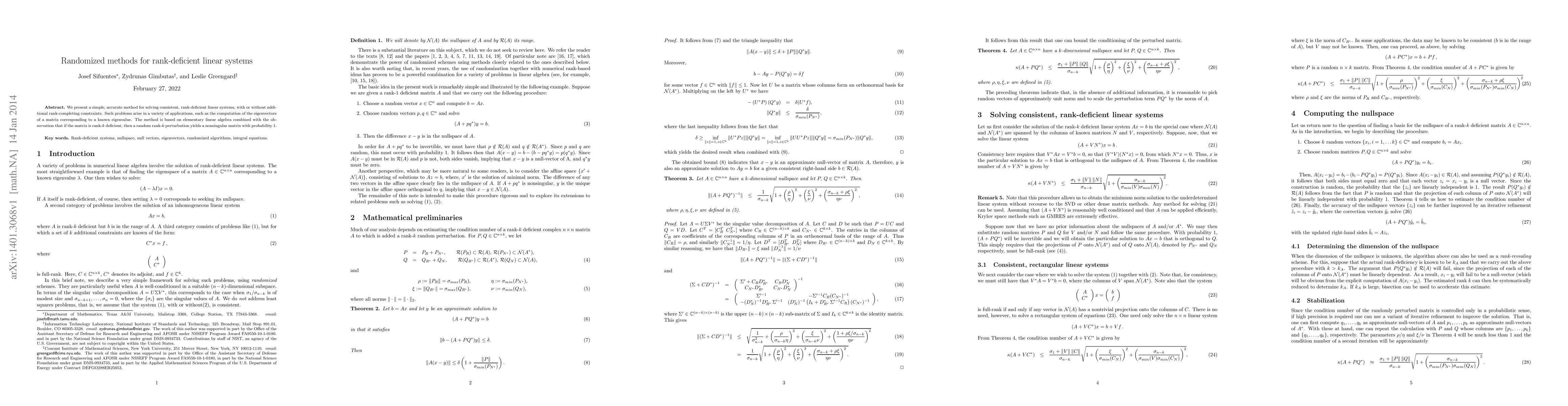 We present a simple, accurate method for solving consistent, rank-deficient linear systems, with or without addi- tional rank-completing constraints. Such problems arise in a variety of applications, such as the computation of the eigenvectors of a matrix corresponding to a known eigenvalue. The method is based on elementary linear algebra combined with the ob- servation that if the matrix is rank-k deficient, then a random rank-k perturbation yields a nonsingular matrix with probability 1.