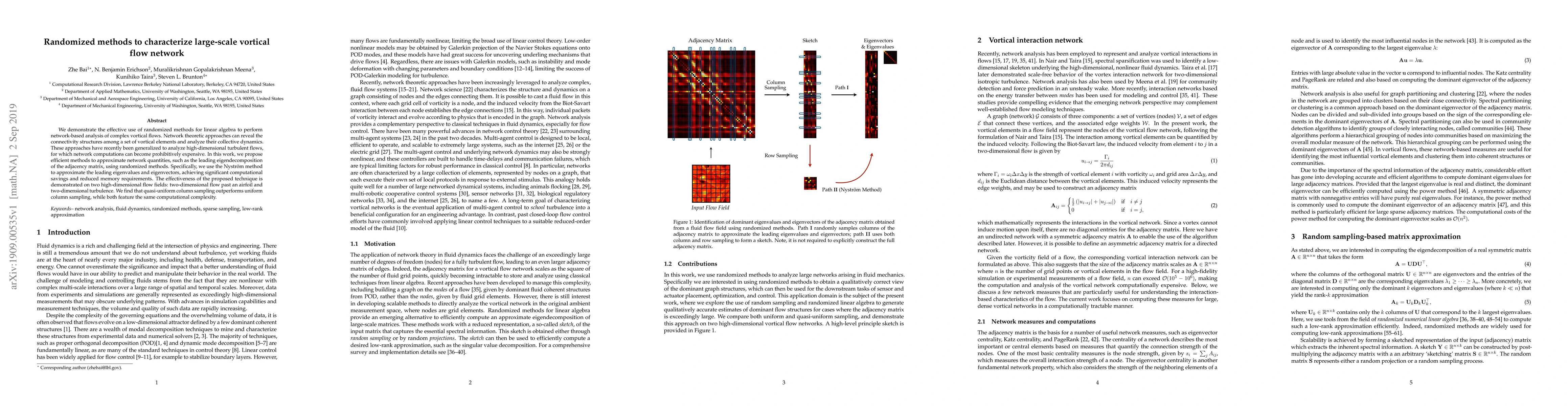 This paper proposes randomized methods for linear algebra to analyze large-scale vortical flow networks, using the Nyström method to approximate leading eigenvalues and eigenvectors efficiently. The technique is demonstrated on two-dimensional flow fields, showing quasi-uniform column sampling as more effective than uniform sampling with similar computational complexity.