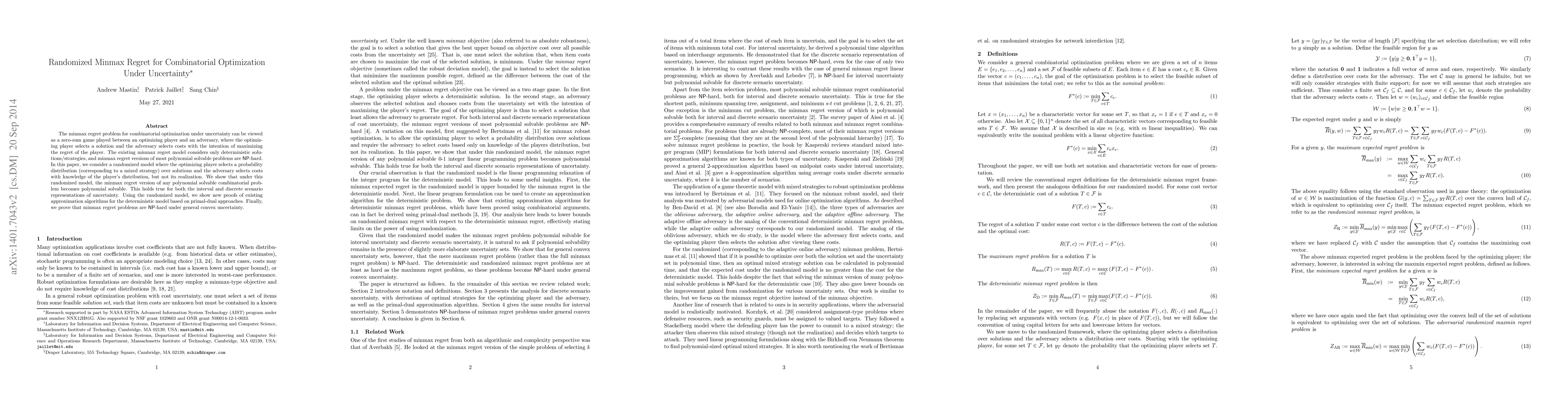 This paper introduces a randomized model for the minmax regret problem in combinatorial optimization, demonstrating that it becomes polynomially solvable under this framework. It also provides new proofs for existing approximation algorithms and shows NP-hardness for general convex uncertainty scenarios.