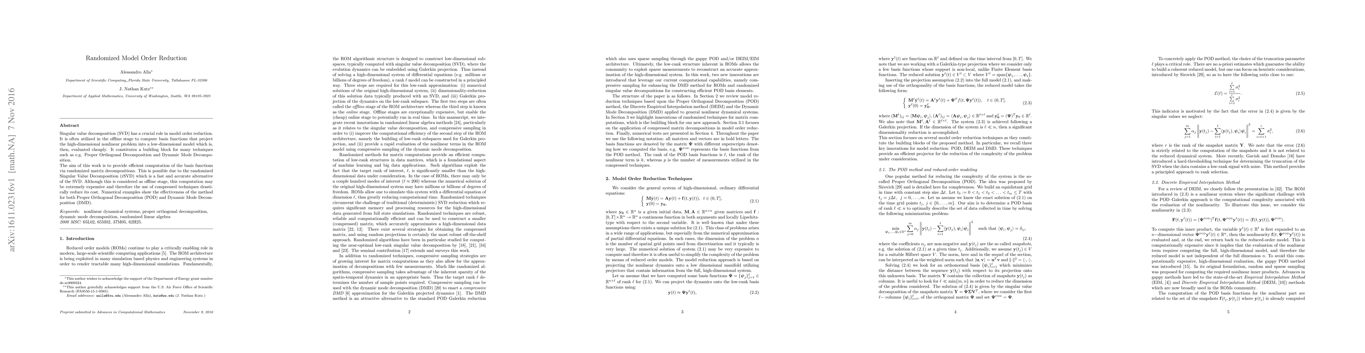 Singular value decomposition (SVD) has a crucial role in model order reduction. It is often utilized in the offline stage to compute basis functions that project the high-dimensional nonlinear problem into a low-dimensionsl model which is, then, evaluated cheaply. It constitutes a building block for many techniques such as e.g. Proper Orthogonal Decomposition and Dynamic Mode Decomposition. The aim of this work is to provide efficient computation of the basis functions via randomized matrix decompositions. This is possible due to the randomized Singular Value Decomposition (rSVD) which is a fast and accurate alternative of the SVD. Although this is considered as offline stage, this computation may be extremely expensive and therefore the use of compressed techniques drastically reduce its cost. Numerical examples show the effectiveness of the method for both Proper Orthogonal Decomposition (POD) and Dynamic Mode Decomposition (DMD).