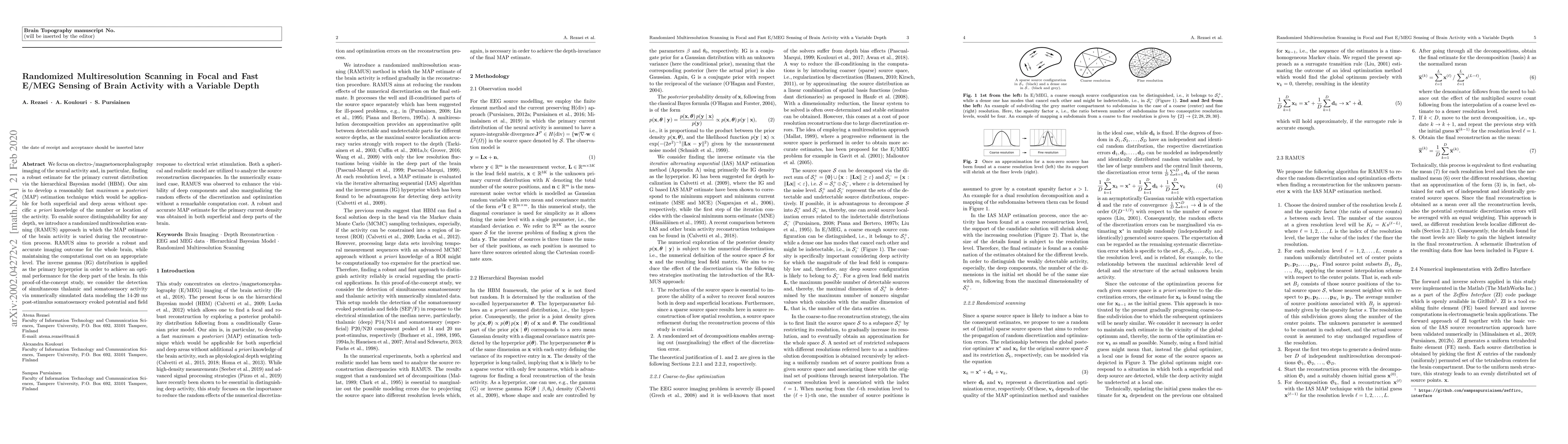 We focus on electromagnetoencephalography imaging of the neural activity and, in particular, finding a robust estimate for the primary current distribution via the hierarchical Bayesian model (HBM). Our aim is to develop a reasonably fast maximum a posteriori (MAP) estimation technique which would be applicable for both superficial and deep areas without specific a priori knowledge of the number or location of the activity. To enable source distinguishability for any depth, we introduce a randomized multiresolution scanning (RAMUS) approach in which the MAP estimate of the brain activity is varied during the reconstruction process. RAMUS aims to provide a robust and accurate imaging outcome for the whole brain, while maintaining the computational cost on an appropriate level. The inverse gamma (IG) distribution is applied as the primary hyperprior in order to achieve an optimal performance for the deep part of the brain. In this proof-of-the-concept study, we consider the detection of simultaneous thalamic and somatosensory activity via numerically simulated data modeling the 14-20 ms post-stimulus somatosensory evoked potential and field response to electrical wrist stimulation. Both a spherical and realistic model are utilized to analyze the source reconstruction discrepancies. In the numerically examined case, RAMUS was observed to enhance the visibility of deep components and also marginalizing the random effects of the discretization and optimization without a remarkable computation cost. A robust and accurate MAP estimate for the primary current density was obtained in both superficial and deep parts of the brain.