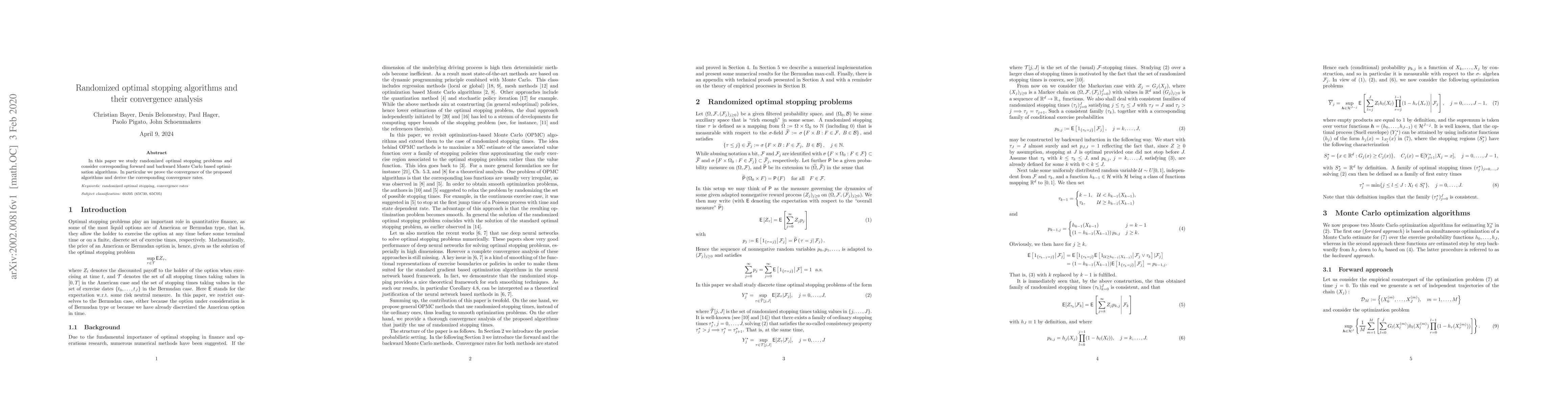 This paper investigates randomized optimal stopping problems and develops forward and backward Monte Carlo optimization algorithms. It proves the convergence of these algorithms and establishes the associated convergence rates.