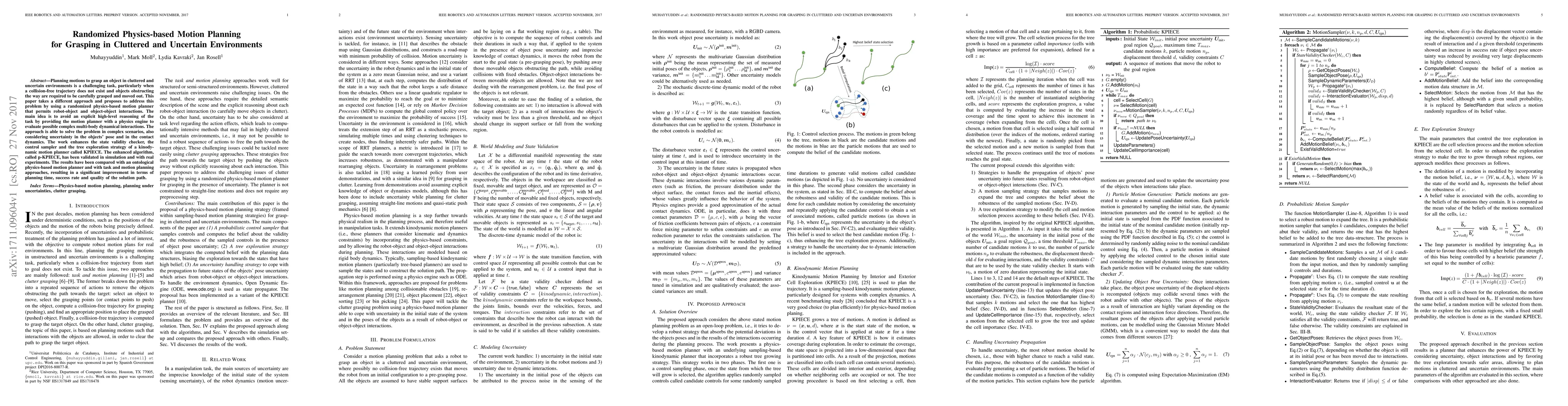 This paper proposes a randomized physics-based motion planner, p-KPIECE, to address grasping challenges in cluttered and uncertain environments. The method enhances KPIECE by incorporating a physics engine to evaluate complex interactions and uncertainties, achieving better planning time, success rate, and solution quality compared to other methods.