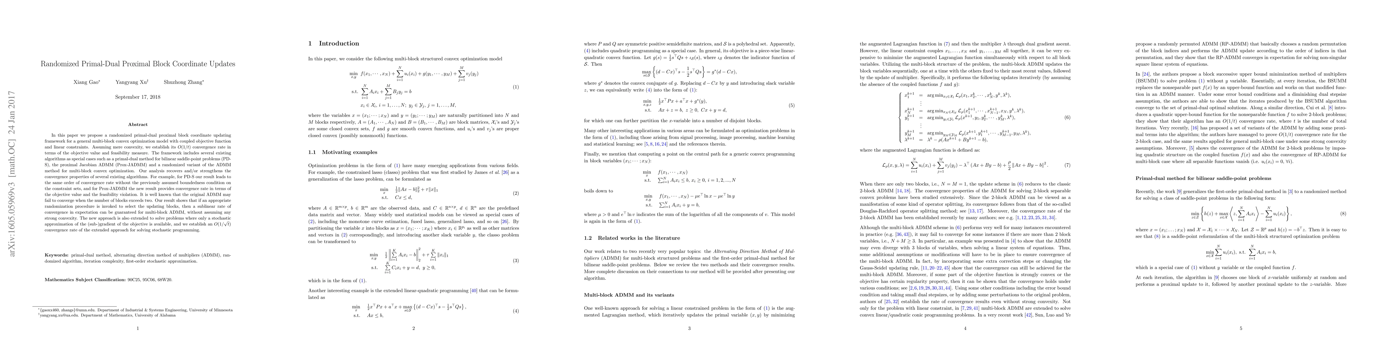 This paper proposes a randomized primal-dual proximal block coordinate updating framework for multi-block convex optimization, achieving $O(1/t)$ convergence. It extends existing algorithms like PD-S and Prox-JADMM, improving their convergence properties and applicability to multi-block ADMM without strong convexity assumptions.