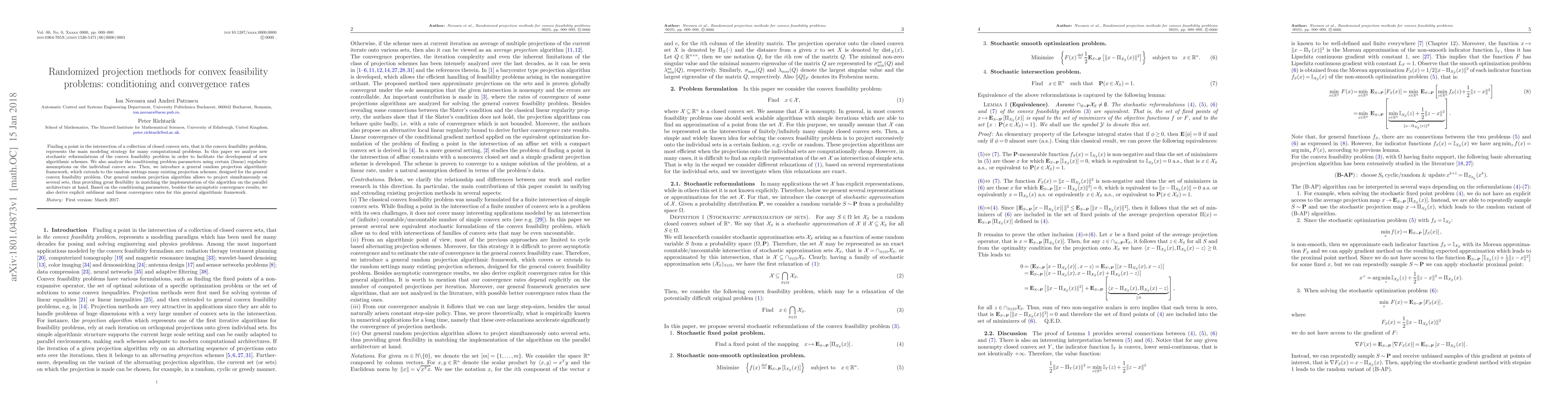 This paper develops new stochastic reformulations for convex feasibility problems and introduces a general random projection algorithmic framework that extends existing projection methods. It analyzes conditioning parameters and provides explicit convergence rates, offering flexibility for parallel implementation.