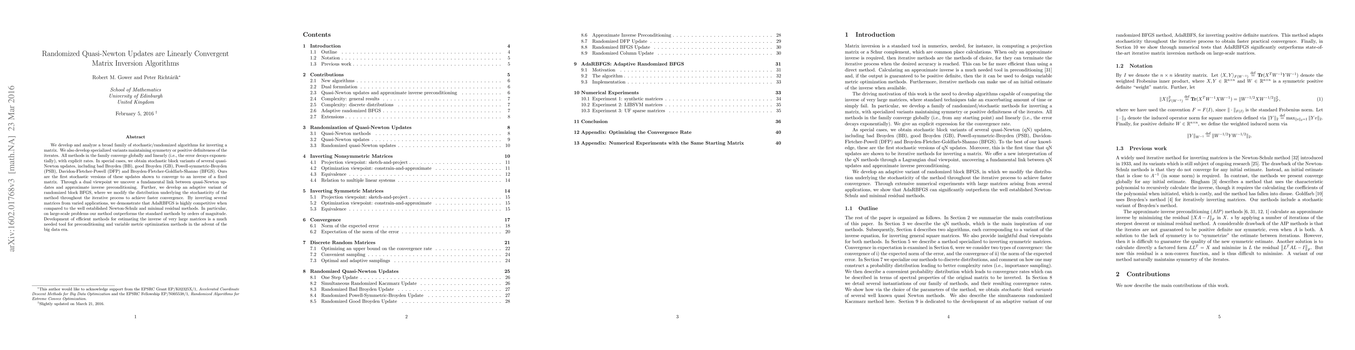 This paper introduces a family of randomized quasi-Newton algorithms for matrix inversion that converge linearly with explicit rates, including specialized variants for maintaining symmetry or positive definiteness. The adaptive variant of randomized BFGS (AdaRBFGS) outperforms standard methods on large-scale problems, making it a highly competitive tool for preconditioning and optimization in big data applications.