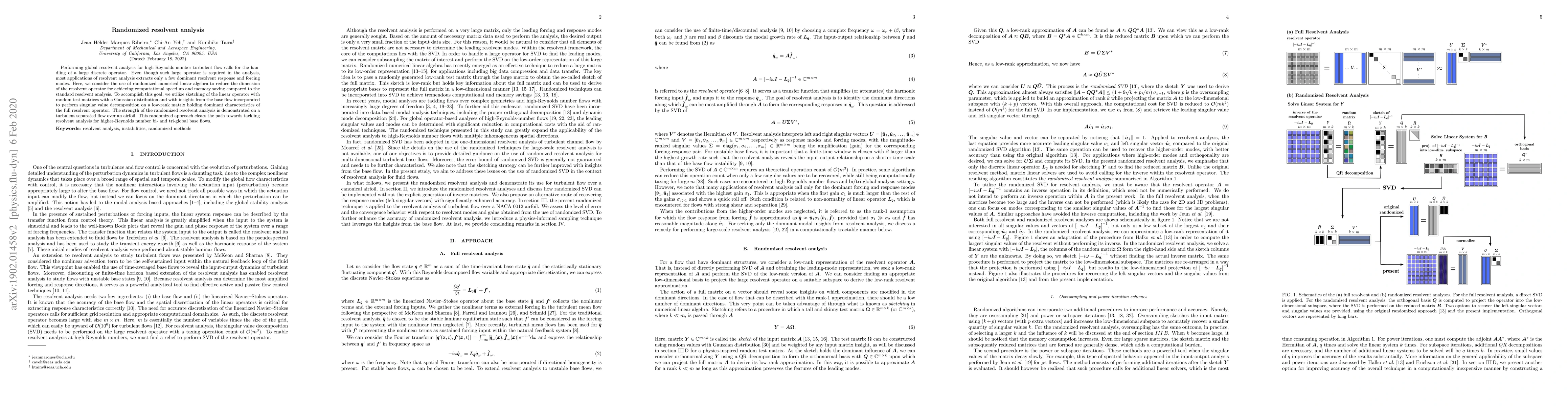 This paper proposes a randomized resolvent analysis method to efficiently handle large operators in high-Reynolds-number turbulent flow analysis. It uses randomized numerical linear algebra to reduce dimensionality, enabling faster computation and memory savings by focusing on dominant modes.