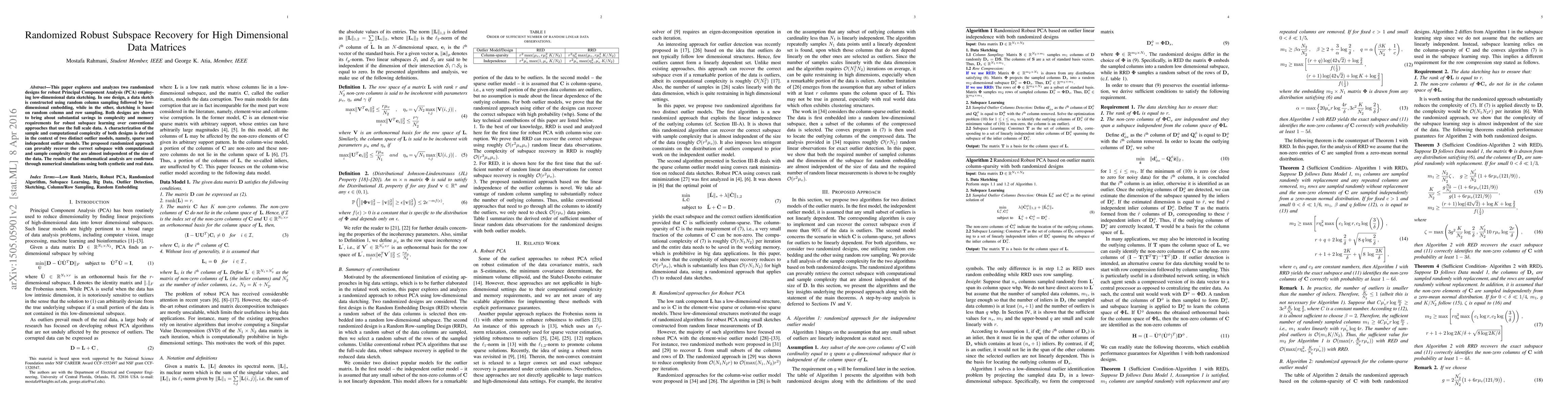 This paper explores and analyzes two randomized designs for robust Principal Component Analysis (PCA) employing low-dimensional data sketching. In one design, a data sketch is constructed using random column sampling followed by low dimensional embedding, while in the other, sketching is based on random column and row sampling. Both designs are shown to bring about substantial savings in complexity and memory requirements for robust subspace learning over conventional approaches that use the full scale data. A characterization of the sample and computational complexity of both designs is derived in the context of two distinct outlier models, namely, sparse and independent outlier models. The proposed randomized approach can provably recover the correct subspace with computational and sample complexity that are almost independent of the size of the data. The results of the mathematical analysis are confirmed through numerical simulations using both synthetic and real data.