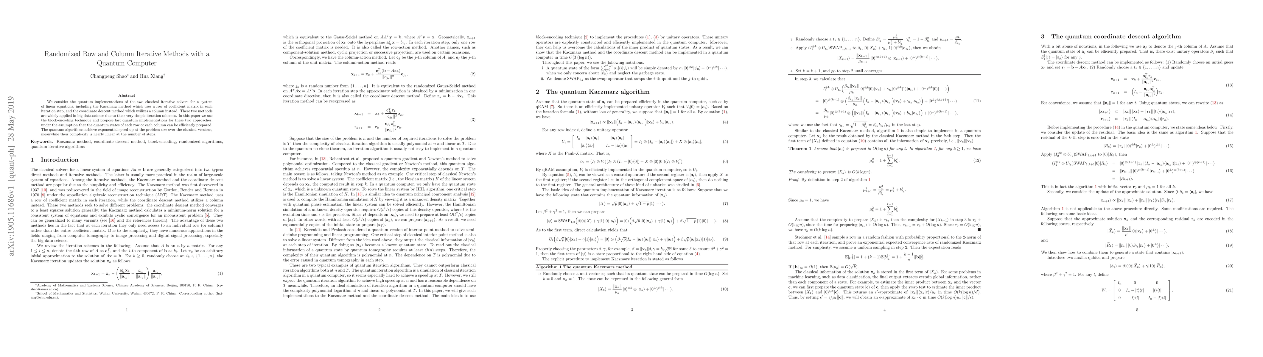 This paper proposes quantum implementations of the Kaczmarz and coordinate descent methods for solving linear equations, leveraging block-encoding techniques. These quantum algorithms offer exponential speed-up compared to classical versions, with nearly linear complexity in the number of iterations.